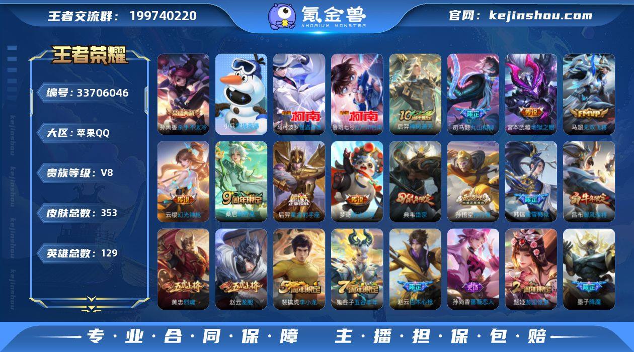 苹果Q 可二次 1典藏2无双4珍品传说18传说129英雄353皮肤 杀手不太冷 器灵螭龙剑 雪境奇遇 器灵落星盏 时之奇旅孙策 江户川柯南 怪盗基德 乘龙淬吴钩 战鼓燎原 九山相柳 神树通天 幻光神枪 愿照岁时盈 愿照千秋盛 愿照众生和 愿照九州拓 愿照山河定 愿照福禄聚 鸣野蒿 启明星使 寅虎瑞焰 无双飞将 黄金射手座 胖达荣荣 地狱之眼 万灵启世 巫礼祀神 御风骁将 山海碧波行 幻珠鲛人 岱宗 龙胆 烈魂 逐霄之志 傲雪梅枪 百木心枪 拒霜思 降魔 孙行者 暗影游猎 暗夜猫娘 电玩小子 黄忠百相守梦 灵蛊蚀心 器灵浮梦炉 炽弈燎原 燃音魔法 伽罗琥珀纪元 百解令 天秀启明 遇见神鹿 无限星赏官 李小龙 水晶猎龙者 暗隐猎兽者 猫狗日记女 金属风暴 地狱岩魂 热力回旋 特工魅影 曙光守护者 特工战影 蔷薇恋人 玩趣恶龙 舞动绿茵 逐浪之夏 心灵战警 修罗 晚萤 千年之狐 紫霞仙子 功夫厨神 心灵骇客 圣诞恋歌 幽灵船长 乘风破浪 圣诞狂欢 末日机甲男 星夜王子 节奏热浪 绅士熊喵 偶像歌手 街头霸王 摇滚巨星 缤纷独角兽 鬼剑武藏 冰雪圆舞曲 花好人间 苍威无极 克喵 演武夺筹 群星魔术团程咬金 驱傩正仪 未来纪元赵云 千军破阵 拳王 沙漠行僧 金庭之子 大漠名商 敏锐之力 云中旅人 丁香结 海盐...