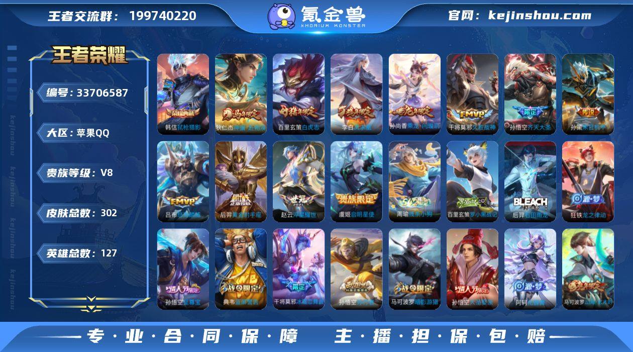 苹果Q-V8-永恒钻石IV段位-127英雄-302皮肤-1典藏皮肤-11传说-95史诗 【英雄全皮】:刘邦全皮 【荣耀典藏】:韩信弑枪猎影 【传说皮肤】:狄仁杰神骥赴朔漠,孙尚香乘龙问璇玑,孙悟空齐天大圣,吕布怒海麟威,孙策末日机甲,赵云淬星耀世,虞姬启明星使,干将莫邪久胜战神,百里玄策白虎志,后羿黄金射手座,李白凤求凰 【限定皮肤】:白起狰,姜子牙天穹之誓,狄仁杰阴阳师,赵云皇家上将,赵云龙胆,墨子神迹守卫,孙尚香蔷薇恋人,鲁班七号狮舞东方,庄周高山流水,高渐离死亡摇滚,高渐离玩趣恶龙,阿轲迷踪丽影,钟无艳超时空战士,扁鹊奇幻香踪,白起夜都怪侠,芈月重明,芈月幻夜卜梦,元歌云间偶戏,元歌无心,夏侯惇朔风刀,夏侯惇匿光决锋者,甄姬落雪兰心,曹操烛龙,典韦穷奇,典韦蓝屏警告,马可波罗暗影游猎,马可波罗山海玄木吟,狄仁杰魔术师,狄仁杰万华元夜,达摩星际陆战队,达摩沙漠行僧,项羽海滩派对,老夫子醍醐杖,老夫子航海奇遇记,程咬金演武夺筹,刘邦夺宝奇兵,韩信飞衡,韩信傲雪梅枪,王昭君午后时光,兰陵王金庭之子,花木兰青春决赛季,花木兰默契交锋,亚瑟潮玩骑士王,孙悟空美猴王,孙悟空至尊宝,孙悟空大圣娶亲,孙悟空孙行者,孙悟空...