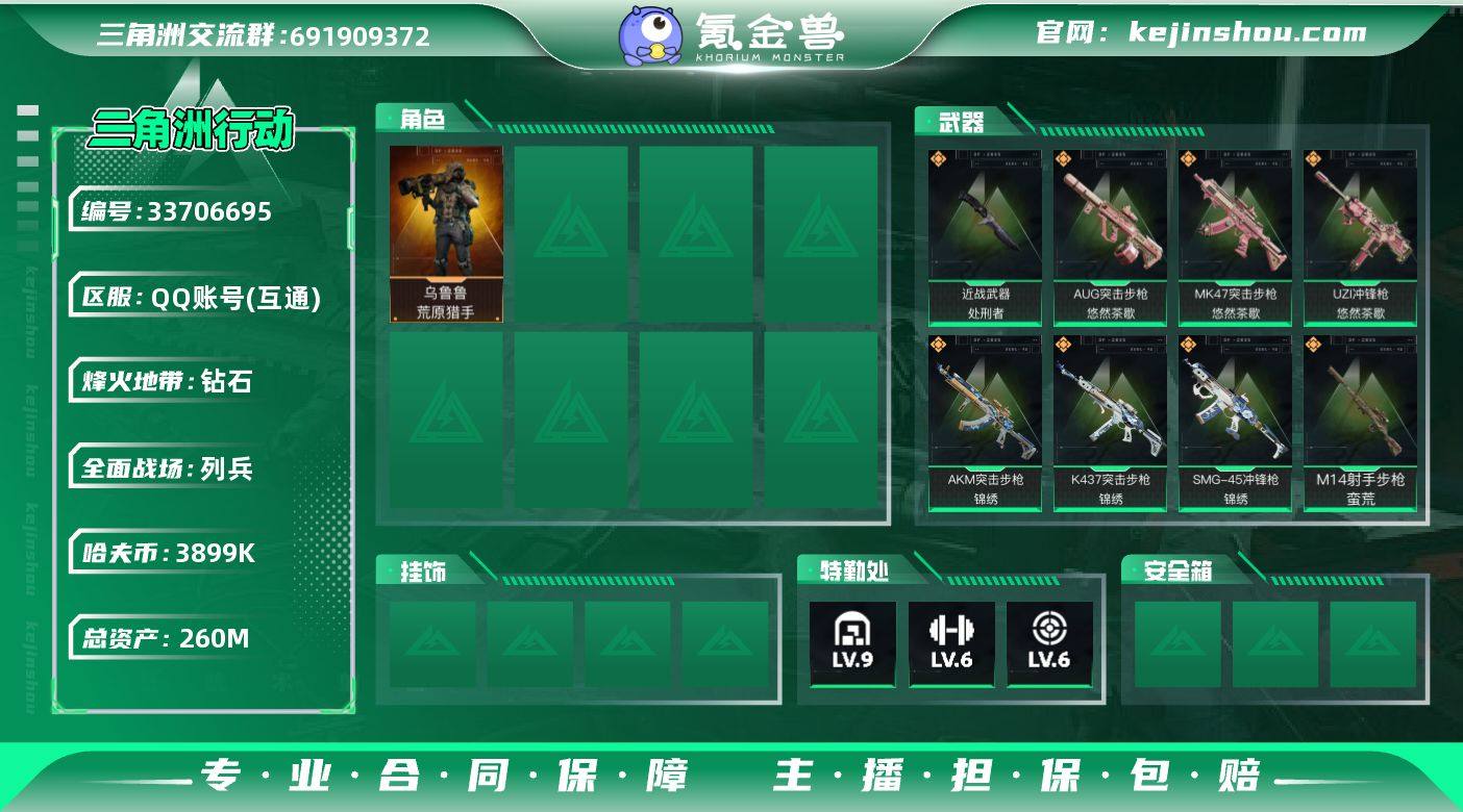 【PTSJZ4916】总资产260M/哈夫币389万/传说近战数1/传说枪皮数7/战场等级9/行动等级60/安全箱等时效性道具以游戏内数据为准,详情请看图/乌鲁鲁-荒原猎手/近战-处刑者/近战-黑鹰/AKM突击步枪-锦绣/AUG突击步枪-悠然茶歇/K437突击步枪-锦绣/MK47突击步枪-悠然茶歇/UZI冲锋枪-悠然茶歇/SMG-45冲锋枪-锦绣/M14射手步枪-蛮荒/K416突击步枪-冬日风情/K416突击步枪-腊梅/SG552突击步枪-深海恐惧/SG552突击步枪-哈夫克警备/SCAR-H战斗步枪-囚徒/K437突击步枪-丛林谍踪/MP5冲锋枪-深海恐惧/MP5冲锋枪-竞技风/SMG45冲锋枪-阿萨拉特攻/SR-3M紧凑突击步枪-开工大吉/勇士冲锋枪-丛林谍踪/MP7冲锋枪-六套之力/PKM通用机枪-阿萨拉特攻/M249轻机枪-丛林谍踪/QJB201轻机枪-炽焰/VSS射手步枪-丛林谍踪/M14射手步枪-工业狂潮/M14射手步枪-航天庆典/M4A1突击步枪-千里骏骨/AKM突击步枪-肃杀/K416突击步枪-一帆风顺/SG552突击步枪-2026/SG552突击步枪-马年新春/SG552突击步枪-贴花艺术/ AK-12突击步枪-马年新春/SCAR-H战斗步枪-荣耀列队/G3战斗步枪-猛禽/CAR-15突击步枪-来财/KC17突击步枪-来财/MP5冲锋枪-弄臣/MP5冲锋枪-哈夫克卫队/MP5冲锋枪-精英联盟/Vector冲锋枪-先锋/UZI冲锋枪-精英联盟/SMG...