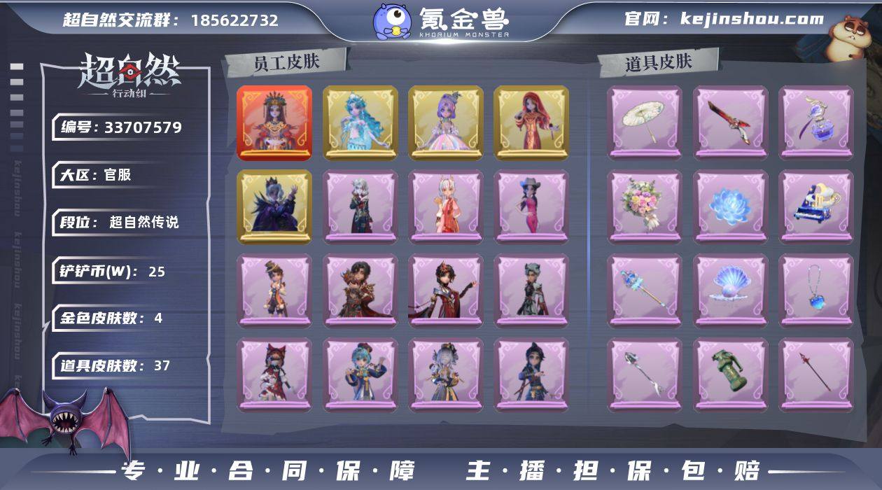 红色皮肤数量: 1 金色皮肤数量: 4 紫色皮肤数量: 21 道具皮肤数量: 37 段位: 超自然传说 外观: 镜生遗梦,遗失的童话,镜花辞,王子与骑士,灵昭鹿鸣,瑞羽衔春,丝缕哀歌,霓裳踏雪,青云逸歌,素影瑶光,泽引山海,情公主,嘻嘻头套,烈焰红唇头套,呆滞头套,炙热烧烤,卑微头套,哈士奇头套,滑稽头套,鱼头怪头套,面具马头套,萨卡班甲鱼头套,小狗蛇点点头套,毛球夹子,天使的呼唤,蝶恋花,小鲨包包,未竟乐园,天使消失的年代,钗头凤,呱呱雨衣,绣春逍影,绒团小狐狸,迷途僵宝,除妖小师妹,火爆了头套,精致露比头套,莓果陷阱,潮汐小海兔,樱桃奶油布丁,仙锋小姐,搬开山,渡鸦公爵,雪墩墩头套,太空鲨头套,黎明猎手,白鼬趴趴,耀眼的你,庆宴绮愿,晚安小熊,烛光纪念,拂云仙,不朽的今夜,牛啤背包,海月息潮,织锦云程,夜浮船,孤独对望,桂冠聆诗,梵卓之礼,春信香囊