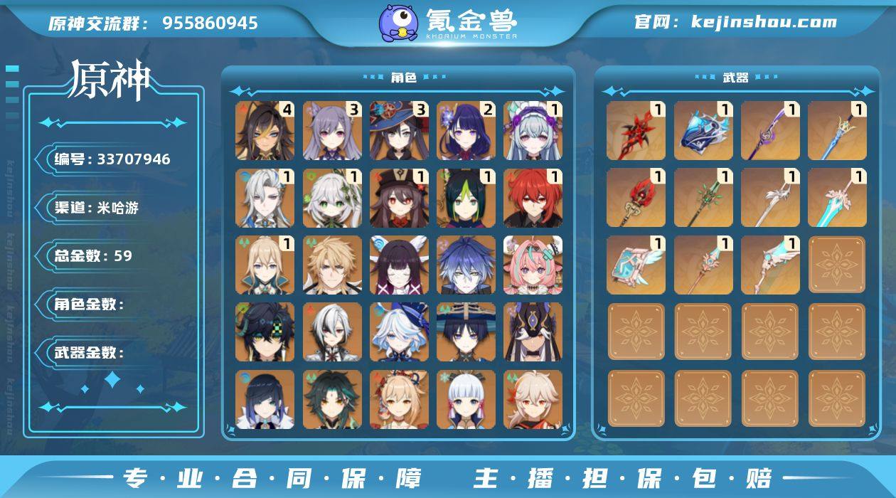 邮箱: 不送邮/死邮 总黄数: 59 冒险等级: 60 4命金色角色: 四命迪希雅 3命金色角色: 三命刻晴,三命莫娜 2命金色角色: 二命雷电将军 1命金色角色: 一命迪卢克,一命琴,一命胡桃,一命提纳里,一命纳西妲,一命那维莱特,一命梦见月瑞希 0命金色角色: 温迪,枫原万叶,优菈,神里绫华,宵宫,七七,钟离,魈,夜兰,赛诺,流浪者,芙宁娜,阿蕾奇诺,基尼奇,瓦雷莎,菲林斯,哥伦比娅,法尔伽 1精武器: 天空之翼,天空之卷,和璞鸢,天空之傲,风鹰剑,天空之脊,护摩之杖,薙草之稻光,苍古自由之誓,万世流涌大典,赤月之形