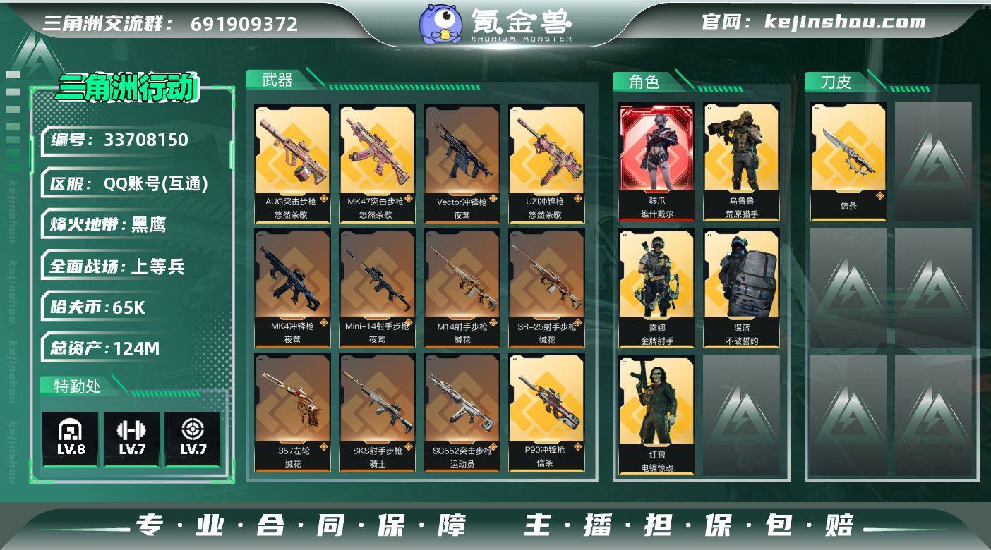【959776】124m总资产-65k哈夫币-60烽火等级-黑鹰-19战场等级-上等兵 【干员外观】:骇爪-维什戴尔,深蓝-不破誓约,红狼-电锯惊魂,露娜-金牌射手,乌鲁鲁-荒原猎手 【近战皮肤】:近战-信条,近战-黑鹰 【传说外观】:M4A1突击步枪-阿米娅,ASh-12战斗步枪-鹅鸭杀,AUG突击步枪-悠然茶歇,SG552突击步枪-运动员,SCAR-H战斗步枪-启航,G3战斗步枪-骑士,CAR-15突击步枪-阿米娅,K437突击步枪-几何解构,KC17突击步枪-电锯惊魂,MK47突击步枪-悠然茶歇,P90冲锋枪-信条,Vector冲锋枪-夜莺,UZI冲锋枪-悠然茶歇,QCQ171冲锋枪-鹅鸭杀,MK4冲锋枪-夜莺,M250通用机枪-几何解构,M250通用机枪-骑士之心,QJB201轻机枪-鹅鸭杀,Mini-14射手步枪-夜莺,M14射手步枪-蛮荒,M14射手步枪-缄花,SKS射手步枪-骑士,SR-25射手步枪-信条,SR-25射手步枪-缄花,SR-9射手步枪-几何解构,R93狙击步枪-维什戴尔,.357左轮-缄花 【史诗外观】:AKM突击步枪-逆战未来,QBZ95-1突击步枪-曙光,ASh-12战斗步枪-无极限,K416突击步枪-冬日风情,K416突击步枪-腊梅,AUG突击步枪-蝮蛇,M7战斗步枪-百步穿杨,SG552突击步枪-深海恐惧,SG552突击步枪-哈夫克警备,SCAR-H战斗步枪-囚徒,G3战斗步枪-...