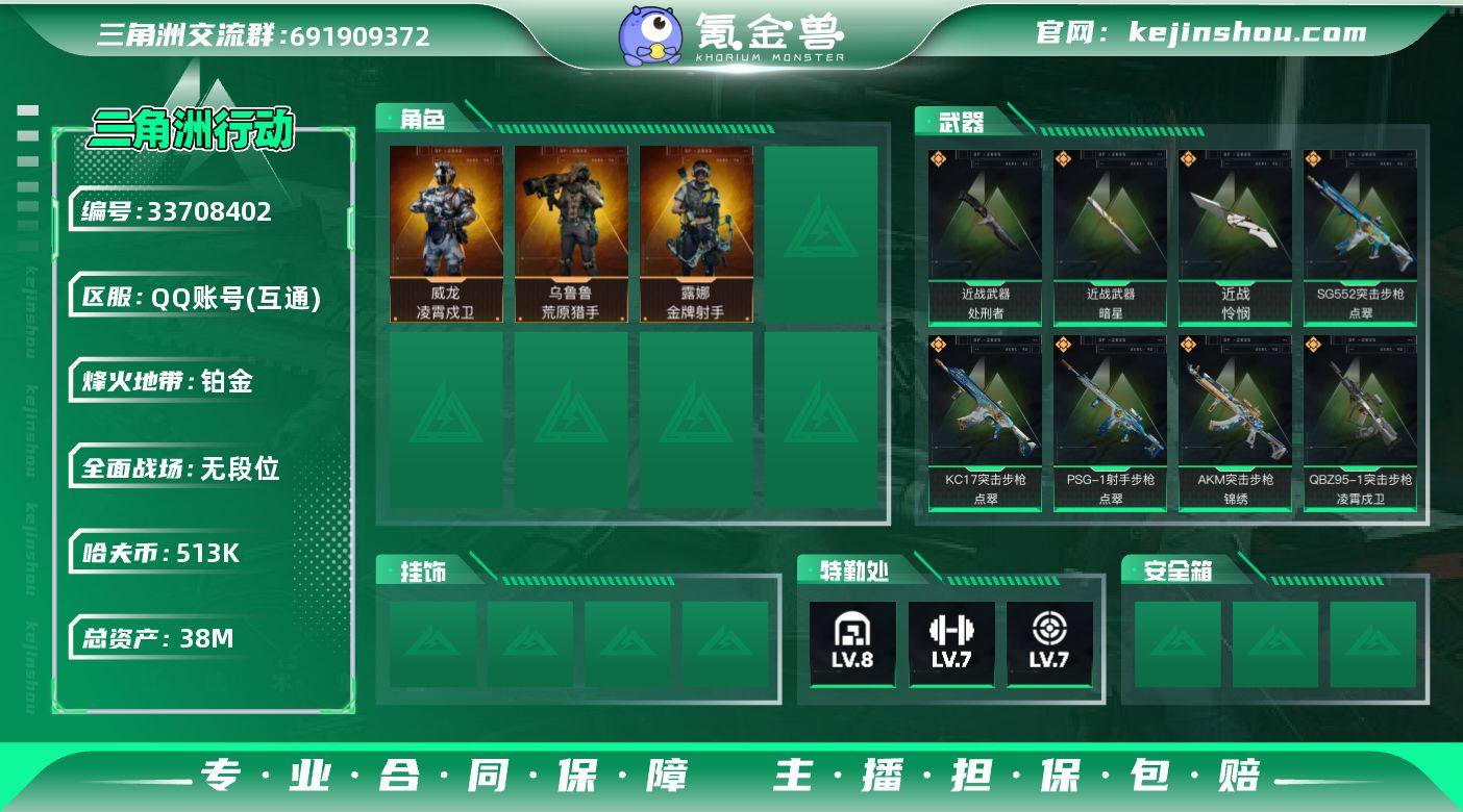 A12933/可二次/QQ区【总资产:38.5M+近战怜悯+近战信条+近战处刑者+威龙凌霄戍卫+满体满负】/烽火等级:60级/全面战场:1级/纯币:513K/三角券加币:70(三角币70+三角券0)【近战-怜悯/近战-信条/近战-处刑者】【威龙-凌霄戍卫】【乌鲁鲁-荒原猎手/露娜-金牌射手】/部门:33332/特勤等级(技术中心3级/工作台3级/制药台3级/防具台3级/仓库8级/指挥中心6级/训练中心7级/靶场7级/潜水中心1级/收藏室0级)QQBZ95-1突击步枪-凌霄戍卫/MK47突击步枪-暗星/AWM狙击步枪-万金泪冠/橙色挂饰x4/段位:钻石(流动资产:10M)/详细看图