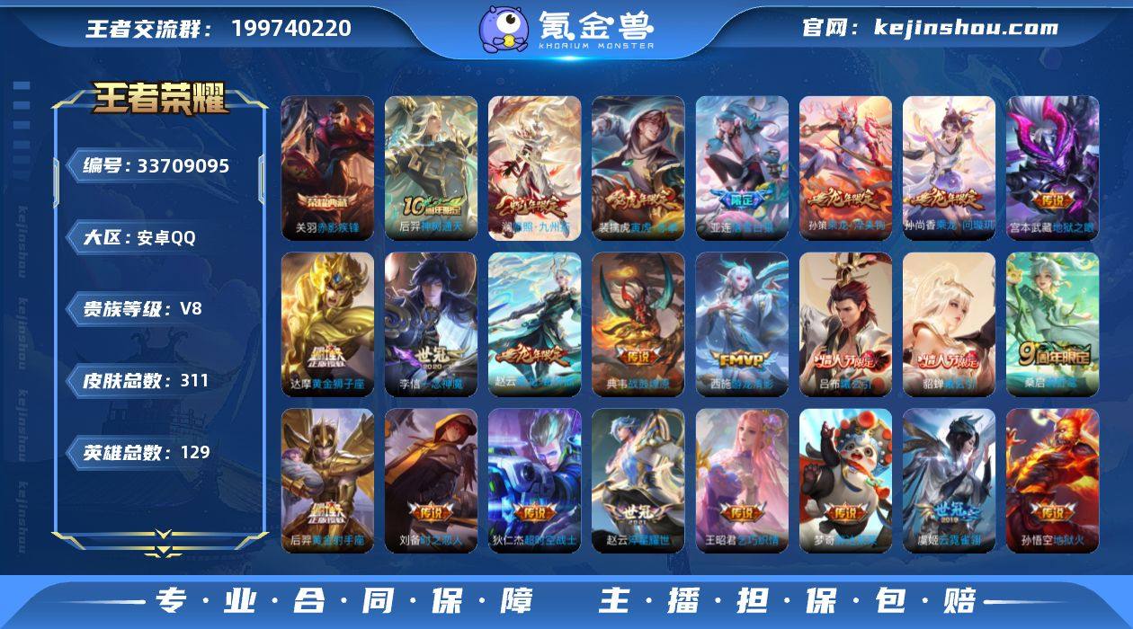 实名: 可修改 性别: 男号 贵族等级: V8 英雄数: 129 皮肤数: 311 荣耀水晶: 赤影疾锋 传说皮: 黄金狮子座,黄金射手座,一念神魔,云霓雀翎,地狱火,音你心动-小乔,地狱之眼,胖达荣荣,乞巧织情,时之恋人-刘备,游龙清影,淬星耀世,超时空战士-狄仁杰,乘龙·问璇玑,乘龙·铭钟鼎,乘龙·淬吴钩,貂蝉曦玄引,吕布曦玄引,典韦战鼓燎原,落雪白狼,神树通天 限定皮: 幽恒,如梦令-嫦娥,如梦令-后羿,孙行者,猪悟能,寅虎·赤拳,鸣野蒿,逐霄战戟,愿照·九州拓 亮点: 【优质装备】:赤影疾锋,黄金狮子座,黄金射手座,一念神魔,云霓雀翎,地狱火,音你心动-小乔,地狱之眼,胖达荣荣,乞巧织情,时之恋人-刘备(电焊工),游龙清影(小青龙),淬星耀世,超时空战士-狄仁杰
