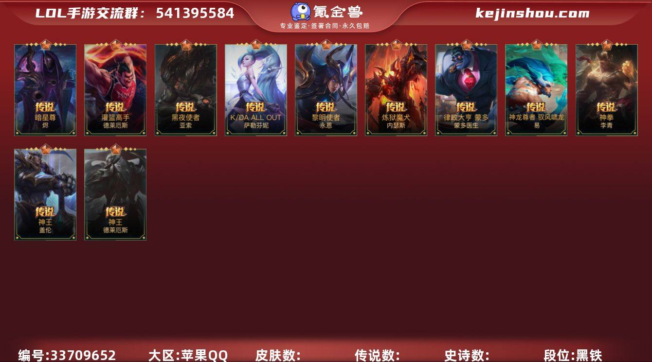 1神话 12传说 48史诗 115皮肤 可二次 可修改实名 【段位】翡翠 【神话皮】芳醇蜜韵 悠米 【传说皮】暗星尊,海魔至尊 亚托克斯,神龙尊者 驭风啸龙,神王诺手,神王盖伦,神拳盲僧,律政大亨,炼狱魔犬,K/DA ALLOUT萨勒芬妮,黑夜使者亚索,灌篮高手,黎明使者永恩