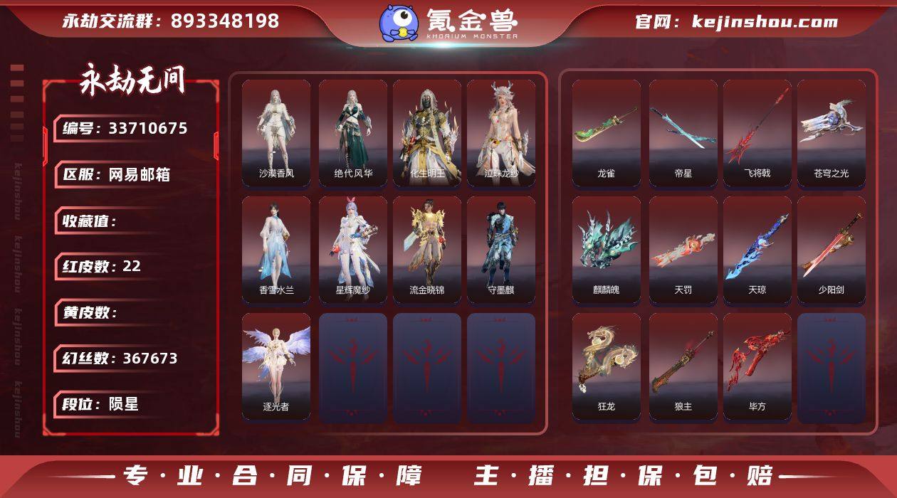 WJ6207,网易邮箱,5月20日可换绑,22红561金,等级484,收藏值398401,三人段陨星4,幻丝367673,金砖625,通行证Lv.16,梦华三排五百天人,声望17,绿野守护竹韵悠,楚韵九歌四海,千秋匠心凶虎,红色神品,香雪水兰,绝代风华,沙漠香风,星辉魔纱,流金晓锦,守墨麒,逐光者,化生明王,狱炎烬甲,泣珠龙纱,天罚,苍穹之光,毕方,麒麟魄,帝星,龙雀,狼主,飞将戟,天琼,狂龙,少阳剑,2674超越型紫,角色金色皮肤,倒反阴阳狐踪,黄庭道,封神录申公豹,武道无穷太极,司天命,若谷,禄运玉霄,封神录龙吉公主,寒烟素,富春山居远山影,夏日派对仲夏霜华,赤丹朱湛,花之倾奇,倒反阴阳凛冬,拳皇不知火舞,千秋匠心玉叶景,长歌诗韵胡旋女,观山海青鸟,龙门飞天,浣烟纱,瀚海苍鹰,福瑞天泽,街头狂欢不败擂主,观山海秋神蓐收,西行劫悟空,封神录哪吒,干将莫邪,百战断链,观山海冬神玄冥,共赴无间幽夜玲珑,春不敛,封神录妲己,春日序曲赤羽,黄昏巫主,玄绶罗衣,秋藏桂,怦然心动悦彩游裳,云溪仙子,绿野守护悠竹萌客,楚韵九歌山鬼,夏日派对极光夏夜,夏日派对高校水着,龙之影过江龙,