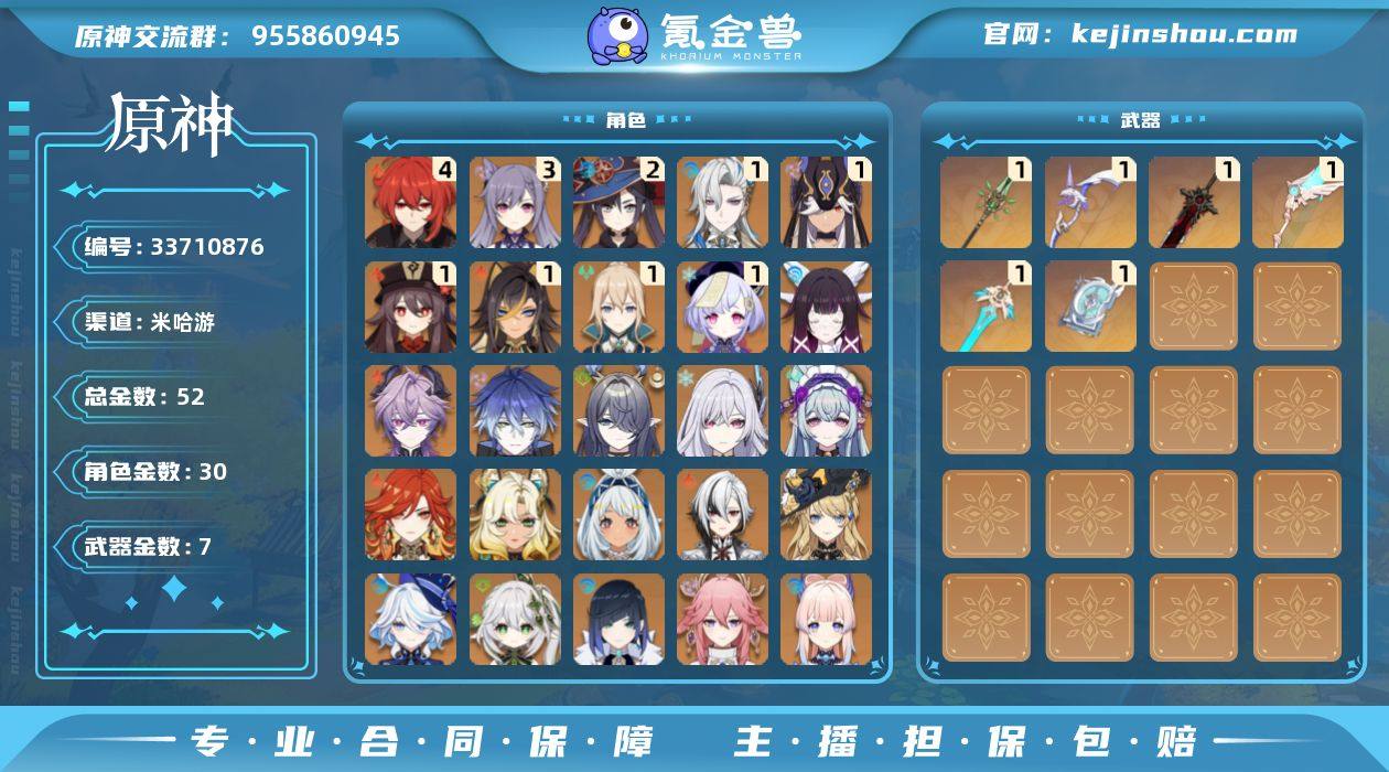 52黄!月绽放!龙芙万希!魔导队!月感电战舰!月结晶战舰一命那维莱特!!四命迪卢克!三命刻晴!二命莫娜!一命七七!一命琴!一命胡桃!一命赛诺!一命迪希雅!温迪!枫原万叶!钟离!雷电将军!珊瑚宫心海!八重神子!夜兰!提纳里!纳西妲!芙宁娜!娜维娅!阿蕾奇诺!玛拉妮!希诺宁!玛薇卡!梦见月瑞希!丝柯克!菈乌玛!菲林斯!杜林!哥伦比娅!拥有武器: 狼的末路!天空之翼!四风原典!和璞鸢!阿莫斯之弓!天空之刃 1精武器: 狼的末路!天空之翼!四风原典!和璞鸢!阿莫斯之弓!天空之刃