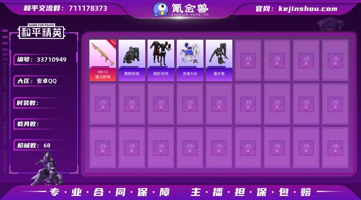 XS11577安卓手Q-3特效枪-42套装-68枪皮-2王牌印记-超级王牌-15324热力值【3特效枪】AKS-74U-森灵之息[4级],AA12-G-萌骑幻想[4级],Mk14-福马献瑞[5级]【2稀有】浪漫天命,暗影哥特【2飞行器】马上有福飞行器,狂鲨锋刃飞行器【1背包】梦幻火箭背包【105其它衣服和枪皮】角色-阿虎,耀动青春,黄色运动,锦灰蝶梦,福马献瑞,琴音绮想,特训学院,白色伏地魔,吉莉礼服,老实芭蕉,绿洲幽影,耀粉歌者,红釉青花,沙漠毒蛇,SS38特训,漫步者,青翼流星,迅捷龙虾,快乐星愿,冰冻风暴,潮流炫酷,狙击之神,旭日情侣,龙的传人,画境星梦,恋语绒绒,鹰眼刺客,海岛探路者,竞技达人朋克,SS36特训,遗迹猎人,马上有钱,雪国风尚,军械专家,星梦畅游,角色-霜刃之御,雨过天青,燕雀桃枝,黑色伏地魔,SS37特训,M416-红色方程式,M417-锦灰蝶梦,MG-36-绿洲幽影,AA12-G-橘猫汽水,M249-冰晶雪宝,ARX-像素花束,大砍刀-像素花束,AKM-星之彼岸,P90-紫矿核心,MG3-火熔核心,AA12-G-雨过天青,MG-36-薄荷星砂,AUG-甜蜜菠萝,莫辛纳甘-鸢尾珑雾,AWM-天降萌叽,SPAS-12-狂鲨锋刃,20-H-狂鲨锋刃,M16A4-雨过天青,UMP45-夜灯,撬棍-冰晶雪宝,ACE32-绿洲幽影,AC-VAL-荒原烈焰,GROZA-影袭,VSS-星之彼岸,SPAS-12-罪夜之冕,M416-糯团青竹,M24-...