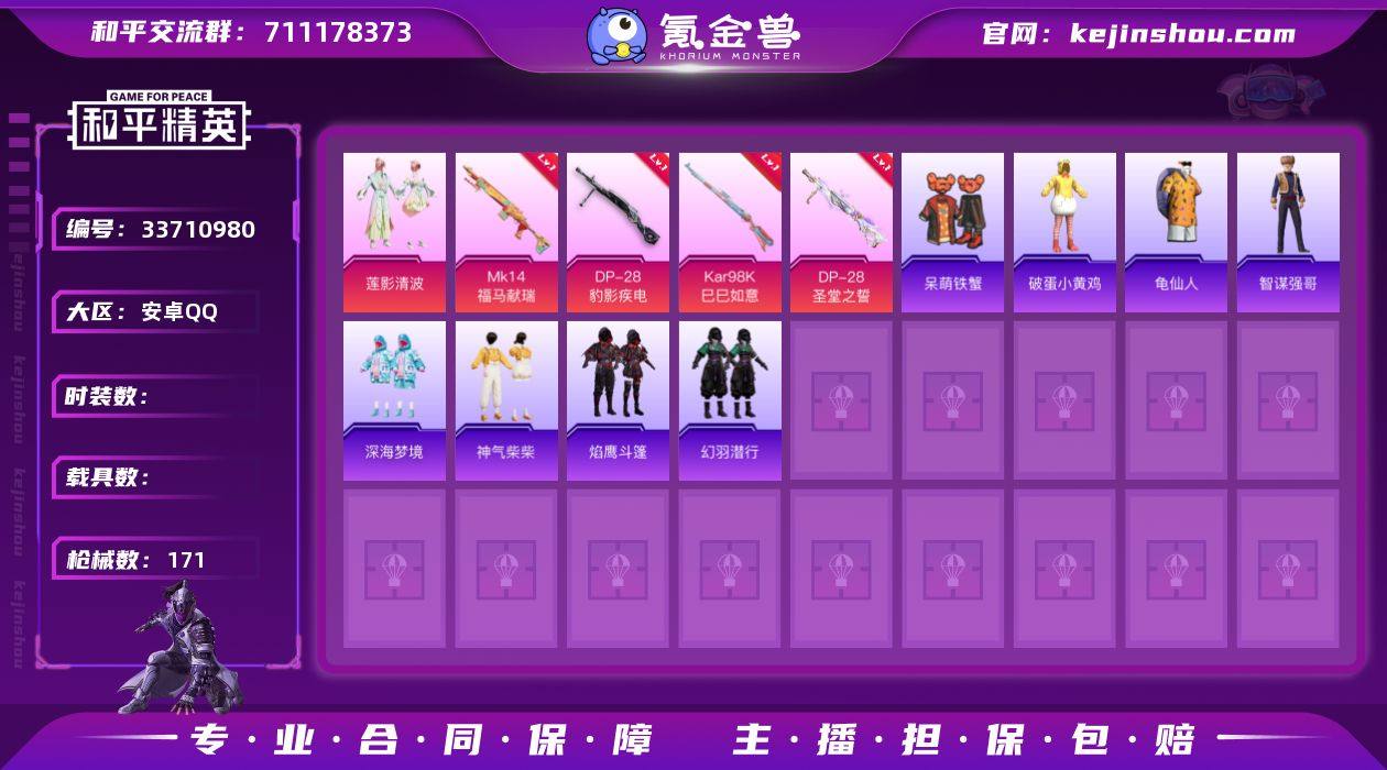XS11605【粉装2 莲影清波 特效枪4 圣堂之誓】安卓手Q-2粉装-4特效枪-143套装-171枪皮-15王牌印记-超级王牌-46253热力值【2粉装】莲影清波,角色-虎痴许褚【4特效枪】DP-28-豹影疾电[5级],Mk14-福马献瑞[5级],DP-28-圣堂之誓[7级],Kar98K-巳巳如意[5级]【4稀有】S686-奇异狩猎者,M762-奇异狩猎者,M24-奇异狩猎者,汤姆逊-奇异狩猎者【4飞行器】马上有福飞行器,登顶巅峰飞行器,异域银装飞行器,空岛之星尾迹【304其它衣服和枪皮】特训学院,轻风白浪,萌趣咩咩,空岛之星,长空猛禽,萌黄之夏,SS20特训,魅力单车,黑夜传说,竞技角斗士,都市魅力,探宝勇士,牛气满满,深海梦境,SS22特训,极地朋克,猎梦纪元,王牌教练,街头潮人,福马献瑞,缤纷果语,虚音幻奏,锦衣飞扬,幻影武者,巳巳如意,惊鸿侠骨,龙的传人,深蓝色名流,SS34特训,幻羽潜行,格斗先锋,阳光火鸡,橘黑制服,冰河战士,贵族骑装,酒红色名流,幽夜迷踪,神气柴柴,麻辣教官,猛禽,SS27特训,SS17特训,元气发射,龙腾端午,涂山之恋,智谋强哥,焰鹰斗篷,青玉碎影,坚韧舞者,绮丽涂鸦,光之冒险,蓝调潮人,森林游猎者,霓虹街区,SS25特训,甜梦熊熊,SS30特训,春日漫步,大橘大利,蓝色运动,柠萌假日,雨林探路者,完美偶像,龟仙人,贝斯之夜,马上来财,电音精灵...