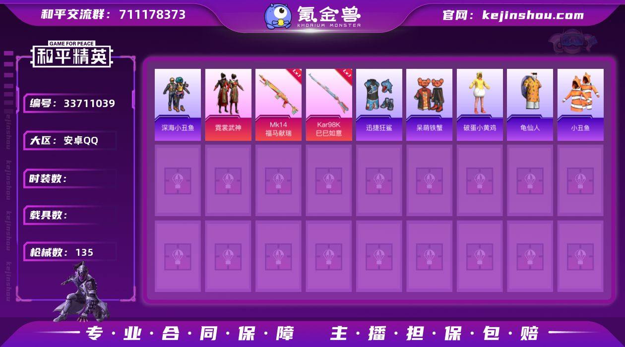 XS11608【粉装2 特效枪4 深海小丑鱼 龟仙人 蓝螳螂】安卓手Q-2粉装-4特效枪-132套装-135枪皮-6王牌印记-坚韧铂金Ⅴ-38863热力值【2粉装】霓裳武神,角色-异瞳寒姬【4特效枪】Kar98K-巳巳如意[5级],AKS-74U-森灵之息[5级],ACE32-萌骑漫游[5级],Mk14-福马献瑞[5级]【2稀有】深海小丑鱼,小丑鱼【6飞行器】极意拳锋飞行器,太空嘟嘟飞行器,炫彩糖果飞行器,狂鲨锋刃飞行器,马上有福飞行器,光之冒险尾迹【1头盔】深海小丑鱼头盔【1背包】深海小丑鱼背包【259其它衣服和枪皮】午间小调,竞技达人朋克,牛气满满,SS21特训,画境星梦,潮流炫酷,核芯基因,白糯汤圆,沙漠毒蛇,元素星魂,特战装甲,SS31特训,阳光菠萝,海岛探路者,萌黄之夏,都市魅力,破蛋小黄鸡,深蓝色名流,角色-Mark.06,SS33特训,冰河战士,完美偶像,黄色运动,SS25特训,角色-绯影武装,创世·追猎,蓝彩潮人,锦衣飞扬,橘黑制服,黄色名流,甜蜜告白,SS22特训,SS37特训,SS29特训,探宝勇士,龙魂突击队,SS26特训,滨海厨神,牛气冲天,魅力单车,战术大师,顶瓜瓜,鹤鸣,SS36特训,湖蓝色名流,SS35特训,特训学院,骑行爱好者,马上有钱,SS24特训,荣耀,酷潮明星,灼焰舞者,SS18特训,SS19特训,迅捷狂鲨,狙击之神,冷焰舞者,街头潮人,绮丽涂鸦,云魄琉璃,...