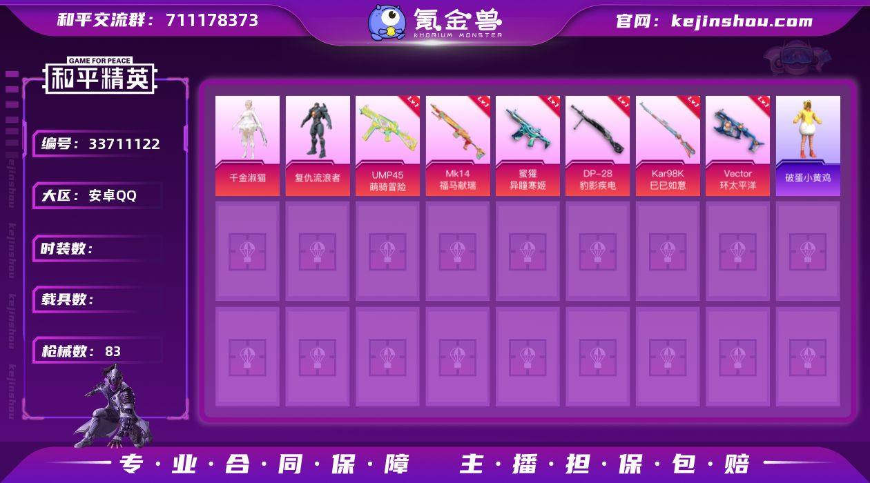 XS11609【可二次】安卓手Q-3粉装-6特效枪-50套装-83枪皮-4王牌印记-不朽星钻Ⅳ-23941热力值【3粉装】角色-千金淑猫,角色-复仇流浪者,角色-异瞳寒姬【6特效枪】Vector-环太平洋[7级],UMP45-萌骑冒险[2级],蜜獾-异瞳寒姬[6级],DP-28-豹影疾电[5级],Mk14-福马献瑞[3级],Kar98K-巳巳如意[4级]【7飞行器】异域银装飞行器,马上有福飞行器,狂鲨锋刃飞行器,暮色之舞飞行器,登顶巅峰飞行器,鸡智如我飞行器,炫彩糖果飞行器【124其它衣服和枪皮】SS37特训,角色-紫俏灵猫,书海巡游,巳巳如意,顽皮玉兔,完美偶像,玲珑侠影,SS33特训,SS38特训,角色-都市丽猫,角色-英勇保护者,SS36特训,雪国风尚,柠萌假日,青翼流星,狂鲨锋刃,朱霞炽焰,琴音绮想,雨林探路者,凌霄紫焰,萌鸡速递,秘语星愿,漫游都市,光之冒险,午间小调,街头风暴,狙击之神,元气之梦,SS34特训,擎苍青焰,海岛探路者,角色-摩登魅猫,破蛋小黄鸡,薄荷星砂,马上有钱,玩偶服-喜羊羊,恋语绒绒,游乐,都市魅力,特训学院,黑色伏地魔,角色-绯色魅影,炫彩糖果,SS35特训,画境星梦,龙的传人,风迹短诗,MG-36-凌霄紫焰,AMR-喜羊羊与灰太狼,ARX-凌霄紫焰,爆炸猎弓-喜羊羊与灰太狼,破片手榴弹-拽到爆炸,破片手榴弹-爆破雪人,SLR-霓彩脉冲,12-风迹短诗,蝎...