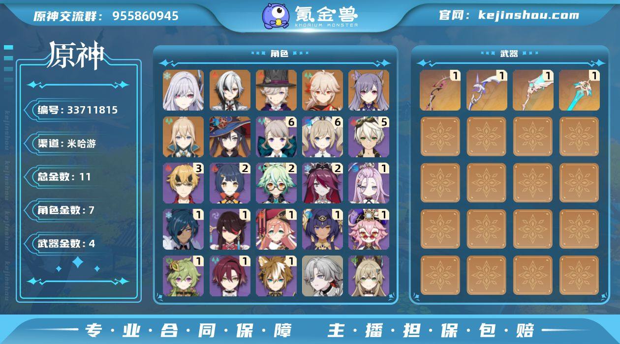 11黄!0+1林尼,枫原万叶,刻晴,莫娜,琴,阿蕾奇诺,丝柯克!拥有武器: 天空之翼,阿莫斯之弓,天空之刃,最初的大魔术 1精武器: 天空之翼,阿莫斯之弓,天空之刃,最初的大魔术