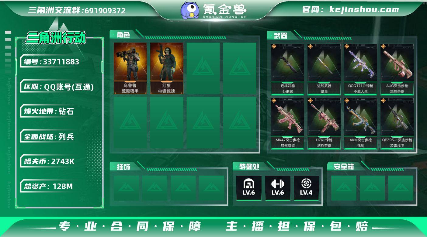 A12958/可二次/QQ区【总资产:128.9M+近战暗星+近战处刑者+非洲之心+25发aw子弹】/烽火等级:60级/全面战场:15级/纯币:2743K/三角券加币:310(三角币230+三角券80)【近战-暗星/近战-处刑者】【乌鲁鲁-荒原猎手/红狼-电锯惊魂】/部门:22211/特勤等级(技术中心3级/工作台3级/制药台3级/防具台3级/仓库6级/指挥中心3级/训练中心6级/靶场4级)(流动资产:119M)QBZ95-1突击步枪-凌霄戍卫/腾龙突击步枪-万金泪冠/MK47突击步枪-暗星/M14射手步枪-蛮荒/SR-3M紧凑型突击步枪-暗星/KC17突击步枪-电锯惊魂/橙色挂饰x2/段位:钻石V/详细看图