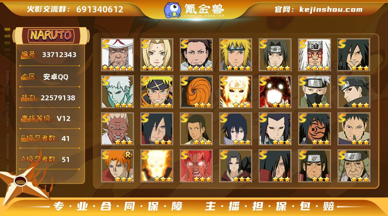 连壮志雄心有神船 组织活动能第一 跨服也能 有麦哲伦 火影战力两千二左右 通灵三件套都有 V12 本服13 288个忍者 秘卷50 老忍法帖差一点就补回来了