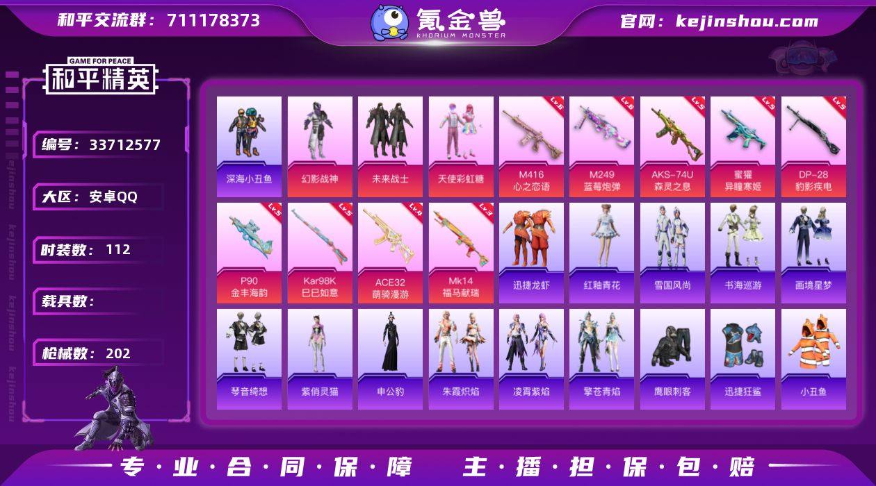 【AZH3751】安卓 手Q【幻影战神 深海小丑鱼 暗影哥特】3粉装-9特效枪-0载具-0粉色飞行器-55525热力值-7王牌印记-112套装-202枪皮 【热门品类】:套装-深海小丑鱼,套装-小丑鱼,角色-军刀雅典娜,套装-暗影哥特 【粉色套装】:粉装-幻影战神,粉装-未来战士,粉装-天使彩虹糖 【粉色枪皮等级】:M416-心之恋语(六级),蜜獾-异瞳寒姬(五级),ACE32-萌骑漫游(四级),AKS-74U-森灵之息(五级),P90-金丰海韵(五级),Kar98K-巳巳如意(五级),Mk14-福马献瑞(三级),M249-蓝莓炮弹(六级),DP-28-豹影疾电(五级) 【粉色枪皮】:M416-心之恋语,蜜獾-异瞳寒姬,ACE32-萌骑漫游,AKS-74U-森灵之息,P90-金丰海韵,Kar98K-巳巳如意,Mk14-福马献瑞,M249-蓝莓炮弹,DP-28-豹影疾电 【粉色降落伞】:星之彼岸降落伞,齐天大圣降落伞,洛神天依降落伞,智耀战神降落伞,异瞳寒姬降落伞,炫彩糖果降落伞 【稀有套装】:套装-雪国风尚,套装-迅捷龙虾,套装-紫幽梦,套装-蓝冰羽,角色-绛羽幽主,套装-朱霞炽焰,套装-凌霄紫焰,套装-擎苍青焰,角色-申公豹,角色-紫俏灵猫,套装-书海巡游,套装-画境星梦,套装-琴音绮想,套装-雨过天青,套装-红釉青花 【稀有枪皮】:AKM-夜灯,AKM-奇异狩...