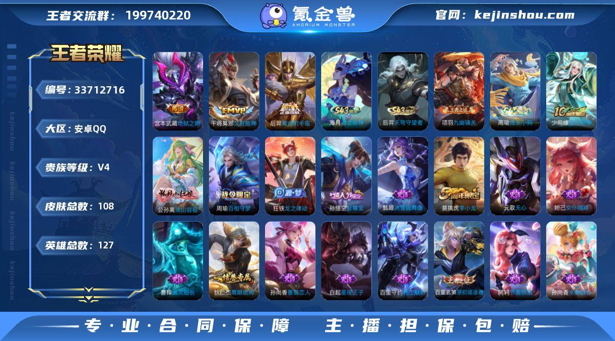 安卓Q-V4-至尊星耀I段位-127英雄-108皮肤-3传说-27史诗 【英雄全皮】:孙权全皮 【传说皮肤】:干将莫邪久胜战神,后羿黄金射手座,宫本武藏地狱之眼 【限定皮肤】:姜子牙天穹之誓,狄仁杰阴阳师,孙尚香蔷薇恋人,元歌无心,项羽海滩派对,兰陵王金庭之子,孙悟空至尊宝,百里玄策原初追逐者,沈梦溪大漠名商,裴擒虎李小龙,鲁班大师探海日志,桑启海盐诗旅,张良古海寻踪,鬼谷子天穹祈灯,沈梦溪龙舞盛年,刘邦剑破天穹,项羽苍威无极,周瑜熔金海岸 【赛季限定】:兰陵王金庭之子,沈梦溪大漠名商,桑启海盐诗旅,鲁班大师探海日志,张良古海寻踪,鬼谷子天穹祈灯,刘邦剑破天穹,姜子牙天穹之誓,太乙真人谧流熔炉,钟馗虚灵犬护,甄姬逆浪荇歌,亚瑟荣光之誓,百里玄策原初追逐者,项羽九幽镇关 【战令限定】:项羽苍威无极,周瑜百相守梦,孙策百相守梦,周瑜线条小狗 【史诗皮肤】:后羿天穹守望者,海月海之女神,周瑜线条小狗,项羽九幽镇关,少司缘巫礼祀神,公孙离涂山容容,周瑜百相守梦,狂铁龙之律动,元歌无心,裴擒虎李小龙,百里玄策原初追逐者,狄仁杰鹰眼统帅,伽罗箭羽风息,孙策猫狗日记,阿轲节奏热浪,白起星夜王子,百里守约特工魅影,雅典娜冰冠...