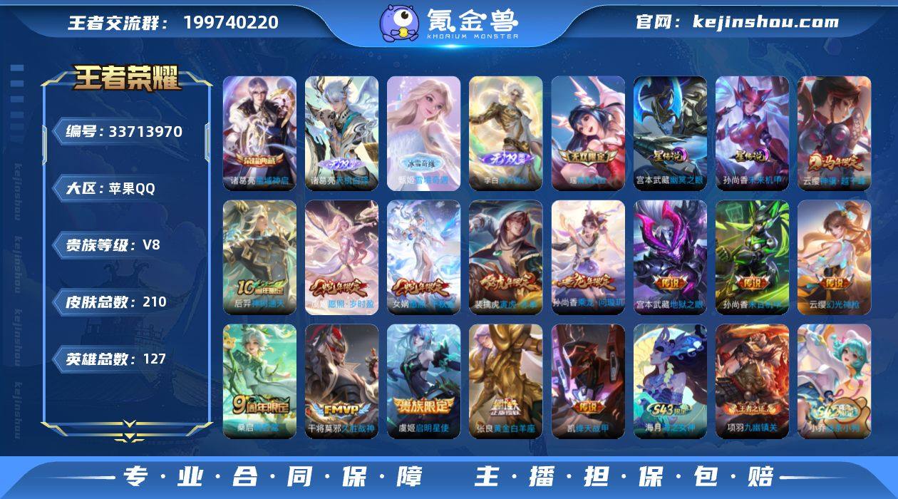 BHC30745,1典藏*4无双*2星元*,苹果Q-V8-至尊星耀V段位-127英雄-210皮肤-1典藏皮肤-4无双-14传说-75史诗 【英雄全皮】:孙权全皮 【荣耀典藏】:诸葛亮星域神启 【无双皮肤】:诸葛亮天机白泽,甄姬雪境奇遇,李白碎月剑心,瑶真我赫兹 【传说皮肤】:云缨神骥越千峰,后羿神树通天,女娲愿照千秋盛,虞姬愿照岁时盈,云缨幻光神枪,桑启鸣野蒿,孙尚香乘龙问璇玑,裴擒虎寅虎赤拳,铠绛天战甲,虞姬启明星使,张良黄金白羊座,干将莫邪久胜战神,孙尚香末日机甲,宫本武藏地狱之眼 【限定皮肤】:李白谪仙醉月,狄仁杰阴阳师,赵云皇家上将,赵云百木心枪,墨子神迹守卫,妲己时之奇旅,孙尚香蔷薇恋人,鲁班七号乒乒小将,高渐离玩趣恶龙,钟无艳超时空战士,芈月白晶晶,吕布御风骁将,元歌云间偶戏,元歌无心,夏侯惇朔风刀,甄姬落雪兰心,狄仁杰魔术师,狄仁杰万华元夜,达摩沙漠行僧,项羽海滩派对,老夫子醍醐杖,老夫子航海奇遇记,程咬金演武夺筹,韩信傲雪梅枪,兰陵王金庭之子,亚瑟潮玩骑士王,孙悟空至尊宝,孙悟空大圣娶亲,李元芳云中旅人,虞姬启明星使,钟馗驱傩正仪,干将莫邪冰霜恋舞曲,雅典娜单词大作战,雅典娜黎明之约,鬼谷子原初探秘者,鬼谷子五...