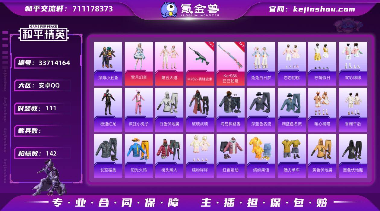 女号-3粉装-6特效枪 地铁已开 深海小丑鱼-39245热力值-3王牌印记-93套装-142枪皮【优质套装】: 第五大道 雪月幻音 鸢尾珑雾【特效枪等级】:M762-青锋波束(五级- M762-青锋波束)Kar98K-巳巳如意(五级- Kar98K-巳巳如意)【优质武器皮肤】: M762-青锋波束 Kar98K-巳巳如意【稀有武器皮肤】: DBS-乌木金纹 蜜獾-精灵梦叶罗丽 SCAR-L-海盐豹豹 GROZA-海盐豹豹 M762-青锋波束 Kar98K-巳巳如意 野牛-雏菊兔兔 Mk14-冰河战士 平底锅-雏菊兔兔 M762-雏菊兔兔 Mini14-雏菊兔兔 R1895-雏菊兔兔 UZI-冰河战士 M16A4-冰河战士 20-H-乌木金纹 PKM-紫幽梦 Mk14-紫幽梦 蜜獾-乌木金纹 S1897-紫幽梦 P92-紫幽梦 PKM-啾咪啾咪 M416-红色方程式 AKM-破晓战魂 AKM-龙的传人 SCAR-L-夜灯 M16A4-幻世战舞者 AUG-天降萌叽 QBZ-洛神天依 QBZ-彩虹符号 M762-第五大道 M762-天降萌叽 蜜獾-天降萌叽 SKS-炫彩节奏 Mini14-耀粉歌者 20-H-莲影清波 UZI-影袭 UZI-天降萌叽 UZI-啾咪啾咪 UMP45-生命誓言 UMP45-夜灯 Vector-龙虾霸霸 汤姆逊-耀粉歌者 汤姆逊-天降萌叽 MP5K-乌木金纹 P90-玩趣呆呆 S12K-玩趣呆呆 S12K-夜灯 DBS-彩虹符号 DP-28-彩虹符号 MG3-第五大道 MG3-幻世战舞者 TMP-9-江南烟雨 战术弩...