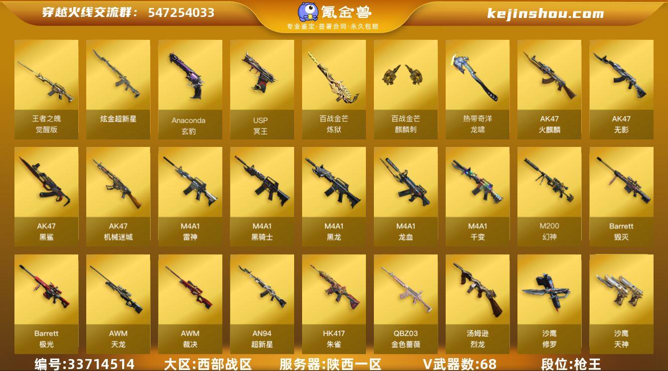 【ky7084】陕西一区-71V-2王者武器数-1炫金武器数 【传说角色】:传说艾莉莎 【热门武器】:QBZ03-金色蔷薇,HK417-朱雀,M200-幻神,M4A1-黑骑士,汤姆逊-烈龙,沙鹰-修罗 【王者炫金武器】:王者炎武,炫金超新星 【音效卡】:AK47-火麒麟音效卡,M4A1-雷神音效卡,M4A1-黑龙音效卡,Barrett-毁灭音效卡,M4A1-赤狱骑士-怀旧音效卡,炼狱-百战金芒-庆典舞曲音效卡 【皮肤】:幻神-宠儿-2021MVP,AWM-裁决-凤灵皮肤,雷神-荣耀之魄,雷神-星空,雷神-紫凛 皮肤,M4A1-再燃火线,火麒麟-心动糖果,毁灭-荣耀之怒,毁灭耀金皮肤,毁灭-星空,毁灭-魔灵皮肤,黑龙-能量核心,黑龙-暗月,黑骑士-暗月*3,黑骑士-战神马超,无影-暗月,无影-能量核心,天启-暗月*2,战神-紫绶金章皮肤,天龙-秘银,天龙-能量核心,极光-能量核心,天神-暗月*3,屠龙-荣耀之锋,轻型军用手斧-再燃火线 【角色】:零,炫,玄豹,零·纪元,奇洋探员,乔伊教练,修道士,云海玲珑,葵-阿尔法武装,暗夜-X,飞虎队-X,风暴女*2,嘉年华灵狐,娟娟,兰-海滩派对,零-水下丽影,灵狐者-黄金海岸,流浪蔷薇,龙儿-小淘气,麻雀,潘多拉-X,潘多拉-甜心教官,潜龙队-X,青霞仙子,斯沃特-X,影武者-X,游珑...
