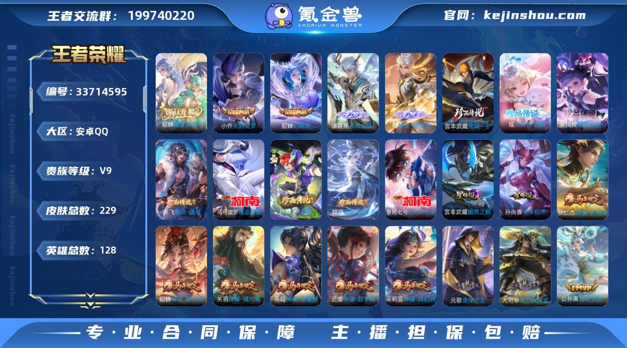 【精品V9·8珍品·天鹅之梦·幻阙歌·馥梦繁花·天机白泽·曜器灵螭龙剑·挚爱童话天幕·满马年限定·无二次包过】YXw25542-安卓Q-128英雄-229皮肤-6王者印记-189铭文-贵族积分13w【贵族9】【2典藏·1珍品无双·2无双·8珍品·3星传说·41传说·1天幕·36按键·326幸运值】【因赛季更新游戏段付以上号为准!】 【英雄全皮】:元歌全皮,孙权全皮,大司命全皮,敖隐全皮,空空儿全皮,影全皮,海诺全皮 【荣耀典藏】:小乔天鹅之梦,貂蝉幻阙歌 【珍品无双】:貂蝉馥梦繁花 【无双皮肤】:诸葛亮天机白泽,曜器灵螭龙剑 【珍品传说】:宫本武藏黑崎一护,安琪拉酷洛米之心,瑶大耳狗之梦,张飞兔狲蓬尾,嫦娥器灵落星盏,孙策时之奇旅,鲁班七号江户川柯南,马可波罗怪盗基德 【星元皮肤】:刘备时之思念,孙尚香未来机甲,宫本武藏幽冥之眼 【天幕】:挚爱童话天幕 【传说皮肤】:云缨神骥越千峰,关羽神骥镇沧海,朵莉亚神骥鸣幻洲,狄仁杰神骥赴朔漠,貂蝉神骥聚万邦,马超神骥逐星野,元歌诡秘之主,大司命死亡执政官,公孙离云诺千山,司空震愿照山河定,女娲愿照千秋盛,妲己愿照众生和,澜愿照九州拓,虞姬愿照岁时盈,云缨幻光神枪,裴擒虎祥瑞亨通,桑启鸣野蒿,夏侯惇霜北刀,海月金乌...