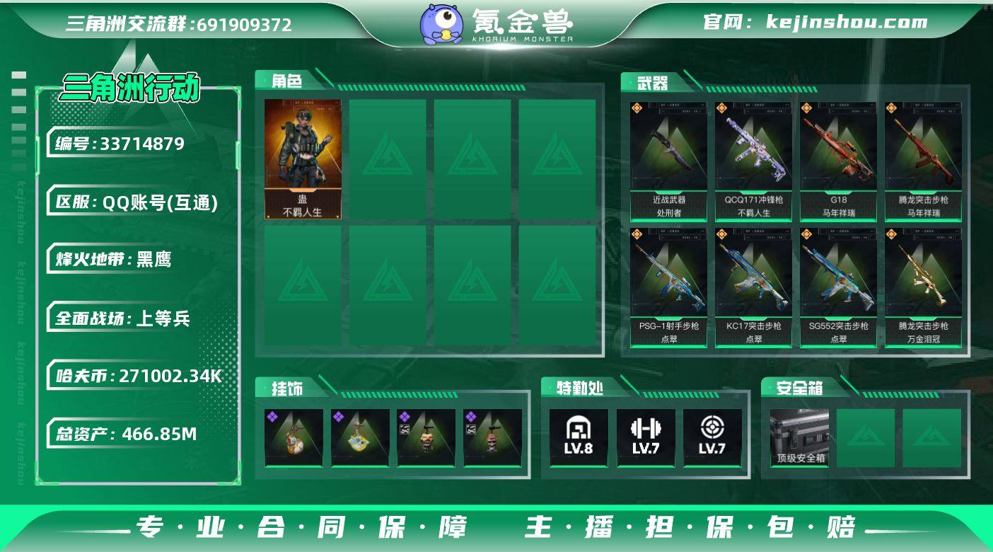三角洲行动S9赛季3X3已完成,顶级安全箱9格,保险全满,仓库资产486.9M,纯币271M,六套二十,A大100发,老塞刀满级,也可以走其他专业平台 账号信息真实,支持验号,随时上号,价格可聊,喜欢直接拍,