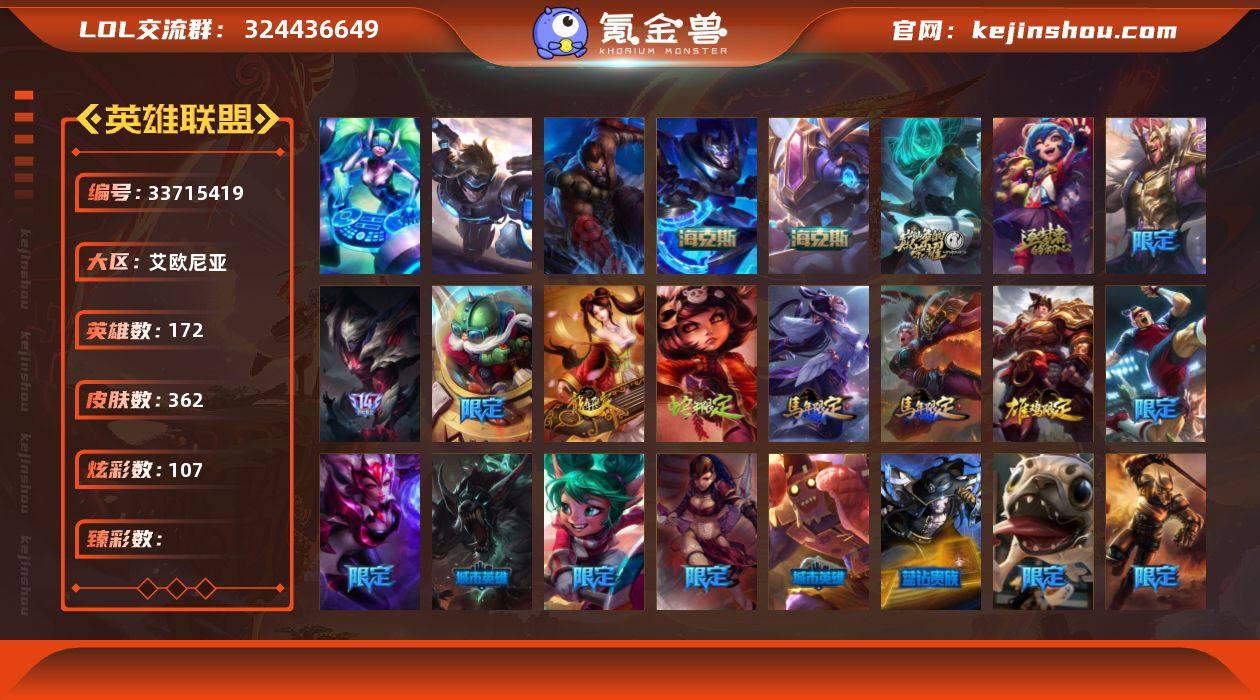 实名: 可修改 英雄数: 172 皮肤数: 362 炫彩数: 107 海克斯: 海克斯 嘉文四世,海克斯 克格莫 限定: 养蜂人 辛吉德 情人节限定: 觅心游侠 卢锡安,觅心之翼 奎因,幽梦玫瑰 泰隆 赛季限定皮: 胜利枪神 格雷福斯,胜利之剑 亚托克斯,胜利女神 娑娜,胜利行刑官 德莱文 冠军限定系列: S1FNC 酒桶,S1FNC 迦娜,S1FNC 库奇,S2 暗杀星 蒙多,S3 SKT T1 贾克斯,S3 SKT T1 李青,S3 SKT T1 婕拉,S4 SSW 炼金,S8 IG 卡莎,S5 SKT T1 滑板鞋,S13 T1 李青 冰雪节限定: 冰雪风暴 希维尔,冬季仙境 发条,胡桃夹子 萨科,平安夜女神 娑娜,魄罗骑士 瑟庄妮,圣诞开心鬼 提莫,圣诞精灵 崔丝塔娜,圣诞狂欢 努努和威朗普,圣诞老人 布隆,圣诞老人 古拉加斯,圣诞糖果棒 厄运小姐,圣诞驯鹿 克格莫,喜庆之树 茂凯,邪恶圣诞老人 维迦,幸福女神 乐芙兰,雪默丁格 泳池派对: 泳池派对 李青,泳池派对 塔莉垭,泳池派对 吉格斯 万圣节限定: 鬼影森森 茂凯,灵魂收割者 索拉卡,魅惑女巫 崔丝塔娜,魅惑女巫 莫甘娜,魅惑女巫 娜美,魅惑女巫 奈德丽,南瓜头 费德提克,无头骑士 赫卡里姆 年限: 古琴余韵 娑娜,张辽 文远,广寒仙子 嫦娥,“你看见过我的熊猫吗?” 安妮,替父从军 花木兰 周年: 2周年 德莱厄斯,4周年 锐雯,5周年 阿...