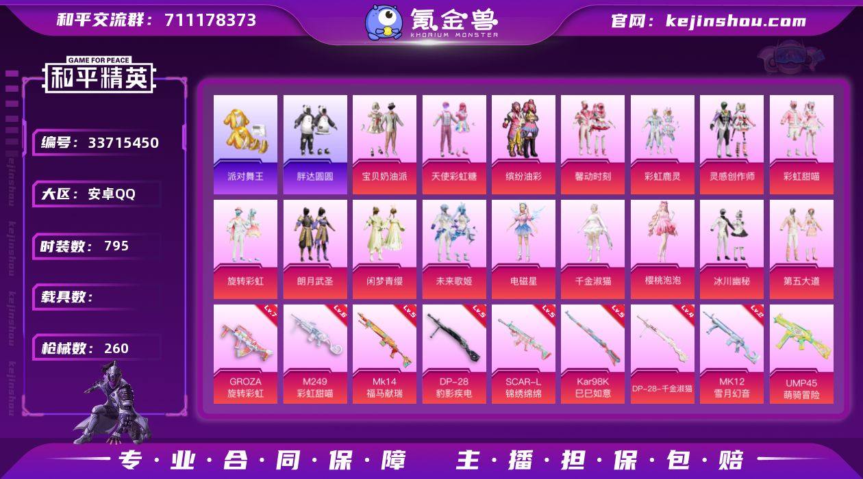 实名: 可修改 时装数: 795 枪械数: 260 热门装扮: 宝贝奶油派,天使彩虹糖,缤纷油彩,馨动时刻,彩虹鹿灵,灵感创作师,朗月武圣,彩虹甜喵,旋转彩虹,冰川幽秘,潮萌小黄鸭,胖达圆圆,兔兔白日梦,派对舞王,第五大道,未来歌姬,闲梦青缨,电磁星,千金淑猫,樱桃泡泡 稀有枪皮: M249彩虹甜喵,GROZA旋转彩虹,SCAR-L-锦绣绵绵,DP-28-千金淑猫,Kar98K-巳巳如意,MK12-雪月幻音,DP-28-豹影疾电,MK14-福马献瑞,UMP45-萌骑冒险 亮点: 【优质装备】:派对舞王(小金鞋),舞王派对(派对舞王、小金鞋),缤纷油彩(猪妹猪脸妹),七级GROZA-旋转彩虹