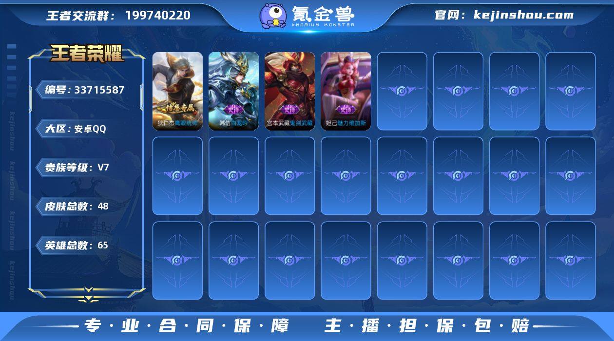 皮肤 可修改实名 男号 【稀有英雄】韩信(韩跳跳),夏洛特(夏师傅),艾琳,橘右京(橘子),娜可露露(鸟人),不知火舞,赵云 【赛季/战令皮】原初探秘者(s21),万华元夜(s22),演武夺筹(s23),驱傩正仪(s24),千军破阵(s25),沙漠行僧(s26),金庭之子(s27),大漠名商(s28),云中旅人(s29) 【史诗皮】紫霞仙子,白龙吟,鬼剑武藏,鹰眼统帅,魅力维加斯 【限定皮】五谷丰年,梁祝 【普通皮】街头霸王,蔚蓝守将,龙腾万里,归虚梦演-曜,海滩派对,沉稳之力,霸王丸,化身博士,乓乓大师,大发明家,教廷特使,星际陆战队(程咬金),阴阳师,兔女郎,死亡骑士,白色死神,野性能量,拳王,孤猎,幸存者,维京掠夺者,潮流仙人,星航指挥官,战争女神,激情绿茵,赤焰之缨,街头旋风,绝影神枪,范海辛,西部大镖客-孙悟空,海军大将,唤灵魔甲