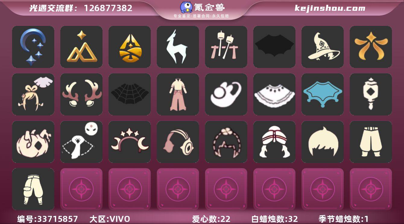 【A726】区服:VIVO服,登入方式:手机【4季卡】牛仔裤洛阳巫师帽绊爱蜘蛛斗蝙蝠斗正太头虚荣发型,蜡烛数量:32,爱心:22,当前身高4.194,最高身高1.523,最矮身高13.523,已经毕业地图:晨岛,霞谷,已经毕业季节:九色鹿季,归巢季,拾光季,夜行季,稀有礼包:阔腿牛仔裤,祥云瑞气服饰,玉兔拖鞋,雪人暖心靴,星月头冠,彩虹耳机,圣诞鹿角,巫师帽,南瓜头,绊爱套装,玉兔,大桔大利,四叶草头饰,AURORA 之翼,皮皮猫装扮,蜘蛛斗篷,蝙蝠斗篷,白雪斗篷,暖冬瑞雪,灯笼,皮皮猫,冰雪水晶球,篝火点心,夏日冲浪,猫耳尾套装,热门物品:蝴蝶结,公主头,正太头,樱花头,猫猫头,搓澡巾,武士裤,白棉裤,背带裤,花环头饰,宴会围巾,红耳机,黄鼠狼面具,红狐狸面具,花瓣斗篷,白金斗篷,白鸟斗篷,尤克里里,高音钢琴,笛子,雨伞