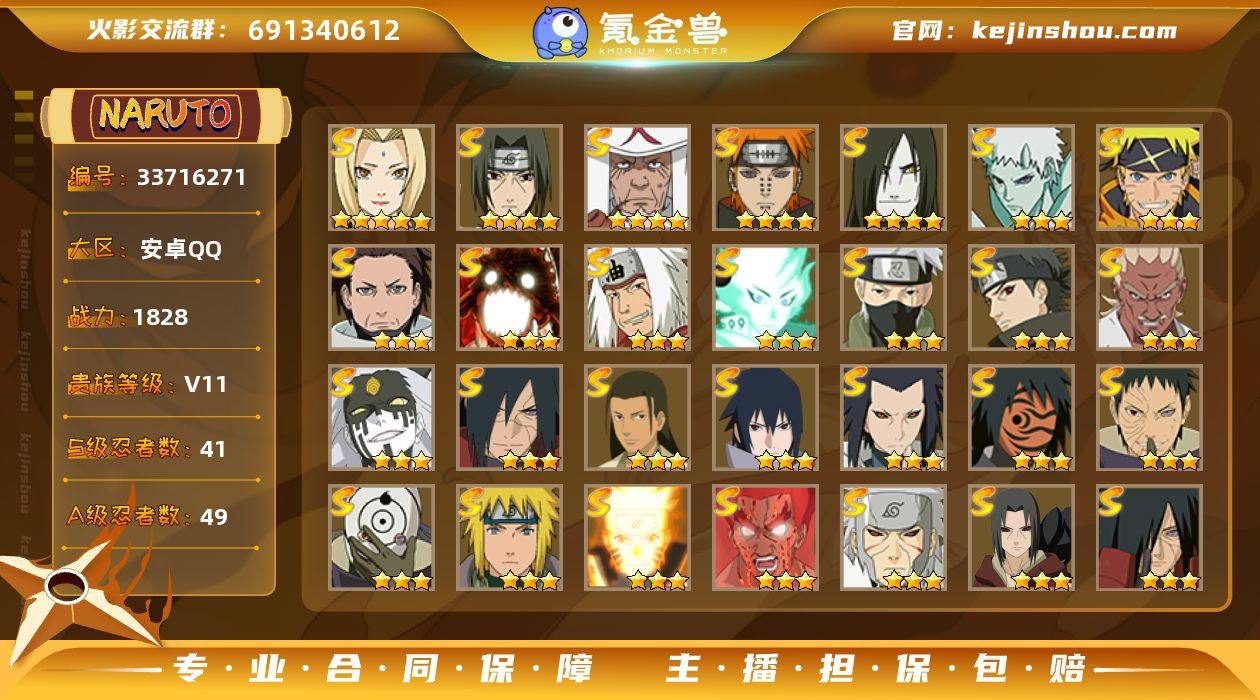 【性价比多忍者号】y7435 战力1828w 41s 49a 熊猫 本服排名63名 五星纲手 四星大蛇丸 三代火影 须佐鼬 佩恩 25忍法帖已开60级 66片金身水门 95片小胡子 64片大野木 90片仙人兜