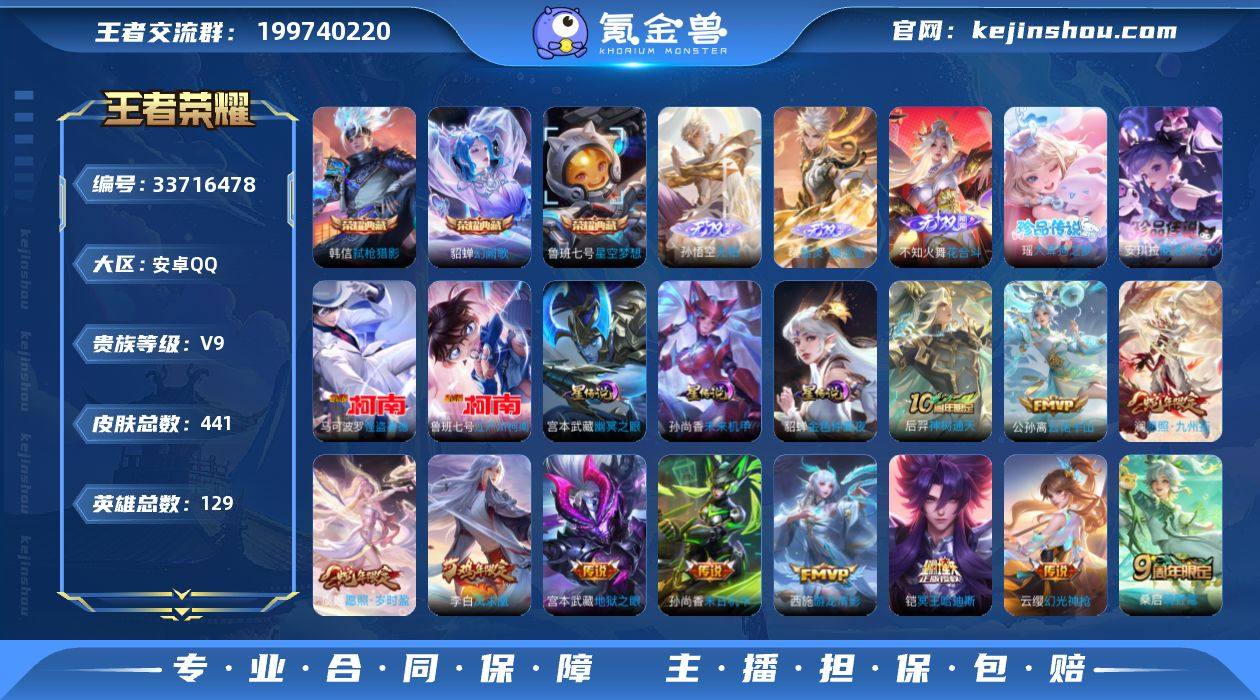 【店长精选带妹号·1.4万战小国韩信·小国阿轲·无相·器灵螭龙剑·花合斗·星空梦想·幻阙歌·弑枪猎影·酷洛米之心·大耳狗之梦·江户川柯南·怪盗基德·愿照九州拓·愿照岁时盈·映山客·冥王哈迪斯·马可波罗妄想实况·燃星之曲·启示之音·游龙清影·凤求凰·无二次包过】YXw25699-安卓Q-129英雄-441皮肤-23王者印记-300铭文-贵族积分10w【贵族9】【3典藏·3无双·4珍品·3星传说·19传说·16按键】【因赛季更新游戏段付以上号为准!】 【英雄全皮】:刘禅全皮,孙权全皮,狂铁全皮,赵怀真全皮,戈娅全皮 【荣耀典藏】:鲁班七号星空梦想,貂蝉幻阙歌,韩信弑枪猎影 【无双皮肤】:孙悟空无相,曜器灵螭龙剑,不知火舞花合斗 【珍品传说】:安琪拉酷洛米之心,瑶大耳狗之梦,鲁班七号江户川柯南,马可波罗怪盗基德 【小国标】:小国标韩信,小国标阿轲 【星元皮肤】:貂蝉金色仲夏夜,宫本武藏幽冥之眼,孙尚香未来机甲 【天幕】:共赏芳华天幕,棉花糖聚会天幕,纸笺情愫天幕 【传说皮肤】:后羿神树通天,公孙离云诺千山,澜愿照九州拓,虞姬愿照岁时盈,云缨幻光神枪,王昭君映山客,桑启鸣野蒿,铠冥王哈迪斯,马可波罗妄想实况,花木兰燃星之曲,露娜启示之音,西施游龙清影,虞姬启明星使,干...