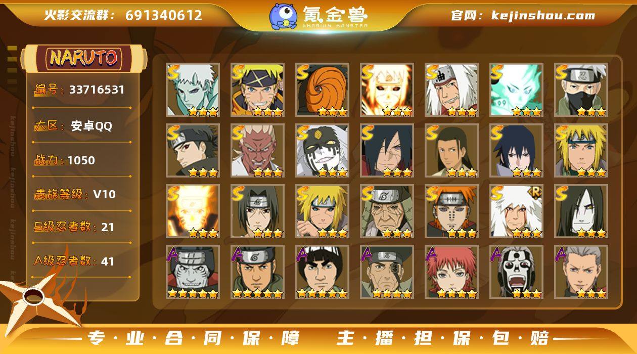 【性价比中配号 活动价】y7364 战力1050w 21s 41a 3个198a 1w4金币 25忍法帖已开90级 75片百豪纲手 42片三代火影 34片小胡子