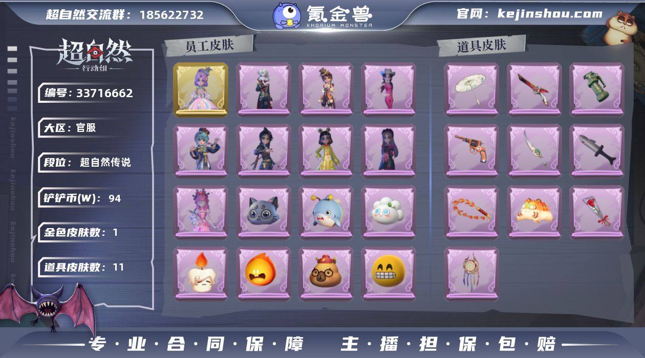 金色皮肤数量: 1 紫色皮肤数量: 8 道具皮肤数量: 11 段位: 超自然传说 员工: 逍遥,薇薇安,巫铃儿,莉莉,阿念,艾伦,小黄,零,爱丽丝,爱德华,兰,小满,临云 外观: 遗失的童话,丝缕哀歌,情公主,嘻嘻头套,烈焰红唇头套,呆滞头套,卑微头套,哈士奇头套,滑稽头套,鱼头怪头套,面具马头套,萨卡班甲鱼头套,蝶恋花,天使消失的年代,呱呱雨衣,绣春逍影,迷途僵宝,小财神豚豚头套,火爆了头套,耀眼的你,庆宴绮愿,炽天使的余烬,烛光纪念,不朽的今夜,牛啤背包,饺饺者头套,孤独对望,园丁鲨鲨头套,梵卓之礼,蛋黄啵啵,煤球喵