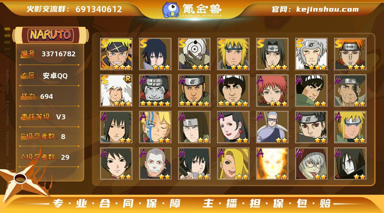 【HYC1878】VIP等级V3/战力694W/S忍数量8/A忍数量29/二星A-日向宁次·忍界大战/二星A-我爱罗「疾风传」/二星A-飞段「死司凭血」/二星A-宇智波鼬/二星A-宇智波止水/三星S-宇智波佐助「永恒万花筒」/五星A-猿飞阿斯玛/2星小南「神驹佑将」/三星S-佩恩「天道」/三星S-漩涡鸣人·宇智波佐助/二星A-照美冥「五代目水影」/三星S-千手扉间/三星S-波风水门/三星A-蝎/五星A-迈特凯/二星A-漩涡博人「桃式显现」/二星A-土台「忍界大战」/2星旗木卡卡西「神威对决」/二星A-长十郎「六代目水影」/二星A-波风水门 「青年」/三星S-自来也「舞之豪杰」/二星A-春野樱「百豪」/三星S-宇智波斑「白面具」/二星A-飞段「恶灵之影」/二星A-黑土「四代目土影」/二星A-迪达拉「秽土转生」/二星A-药师兜「半蛇斗篷」/二星A-飞段/二星A-宇智波泉奈/二星A-迪达拉/二星A-漩涡鸣人「九尾查克拉」/二星A-不缘/二星A-迈特凯「青春爆炸」/二星A-宇智波佐助「须佐能乎」/五星A-干柿鬼鲛/二星A-大蛇丸「晓」/三星S-宇智波鼬 「须佐能乎」