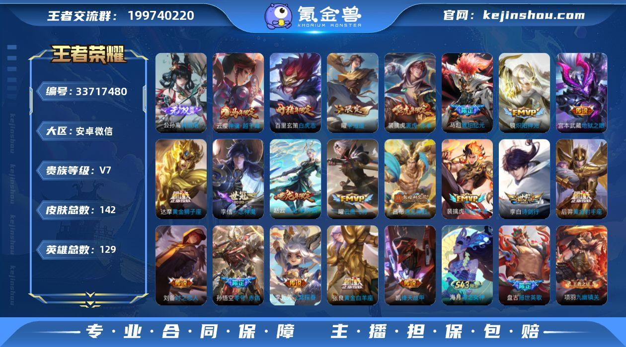 实名: 可修改 性别: 男号 贵族等级: V7 英雄数: 129 皮肤数: 142 无双皮: 离恨烟 传说皮: 黄金狮子座,黄金射手座,云鹰飞将,绛天战甲,黄金白羊座,炽阳神光,一念神魔,零号·赤焰,地狱之眼,飞鸢探春,李逍遥,时之恋人-刘备,遇见神鼓,琥珀纪元马超,乘龙·铭钟鼎,祥瑞亨通,神骥·越千峰 限定皮: 李小龙,岱宗,神威,白虎志,寅虎·赤拳,诗剑行,山海·玄木吟 亮点: 【优质装备】:离恨烟(公孙离无双),黄金狮子座,黄金射手座,云鹰飞将(小将军),绛天战甲(鸡嘴战神),黄金白羊座,炽阳神光,一念神魔,零号·赤焰,地狱之眼,飞鸢探春,李逍遥,时之恋人-刘备(电焊工),遇见神鼓,琥珀纪元马超