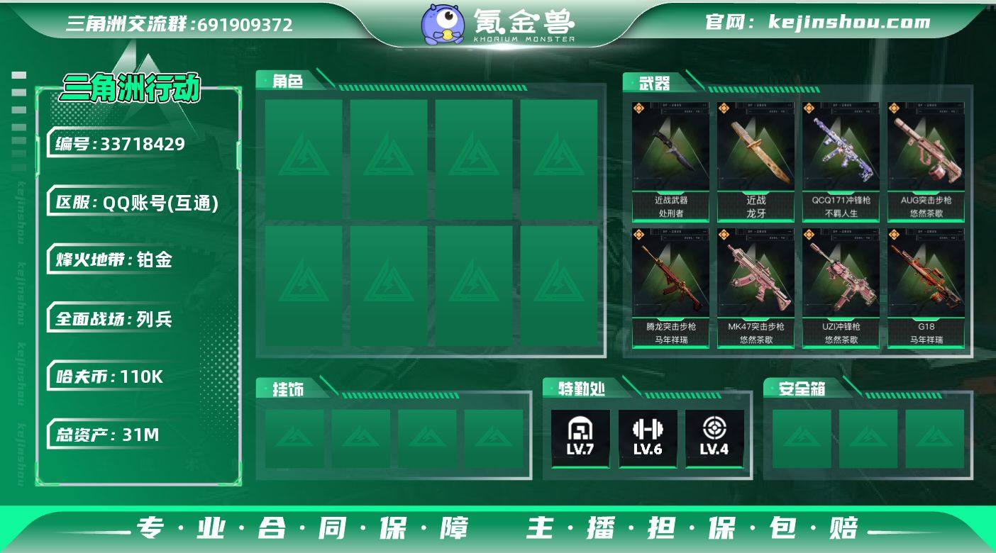 【959957】31m总资产-110k哈夫币-60烽火等级-铂金-17战场等级-列兵 【近战皮肤】:近战-龙牙,近战-处刑者1级,近战-黑鹰 【传说外观】:AKM突击步枪-锦绣,QBZ95-1突击步枪-凌霄戍卫,K416突击步枪-行动记录,AUG突击步枪-悠然茶歇,腾龙突击步枪-马年祥瑞,腾龙突击步枪-万金泪冠,K437突击步枪-锦绣,MK47突击步枪-悠然茶歇,UZI冲锋枪-悠然茶歇,SMG-45冲锋枪-锦绣,勇士冲锋枪-万金泪冠,QCQ171冲锋枪-不羁人生,M14射手步枪-蛮荒,M14射手步枪-缄花,SR-25射手步枪-缄花,AWM狙击步枪-万金泪冠,.357左轮-缄花,G18-马年祥瑞 【史诗外观】:K416突击步枪-腊梅,SG552突击步枪-深海恐惧,腾龙突击步枪-猎鳄行动,K437突击步枪-丛影谍踪,SMG-45冲锋枪-阿萨拉特攻,SR-3M紧凑突击步枪-开工大吉,勇士冲锋枪-丛影谍踪,MP7冲锋枪-六套之力,PKM通用机枪-蝮蛇,M249轻机枪-丛影谍踪,QJB201轻机枪-炽焰,VSS射手步枪-丛影谍踪, M14射手步枪-航天庆典 【稀有外观】:M4A1突击步枪-银灰金属,SV-98狙击步枪-花岗岩,M7战斗步枪-天际线,M14射手步枪-天际线*2,M700狙击步枪-极地勘察队,AUG突击步枪-千里骏骨,M4A1突击步枪-千里骏骨*2,QJB201轻机枪-千里骏骨,AS Val突击步...