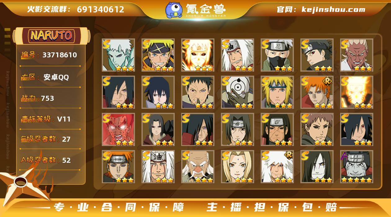 【性价比多忍者多金币】y7348 战力753w 27s 53a 1个298+5个198a 4w金币+月卡里1.2w金币+50高招卷 1个a忍传承时装 博人传主场景 三代62片 虎皮33片 半藏78片 仙人兜51片