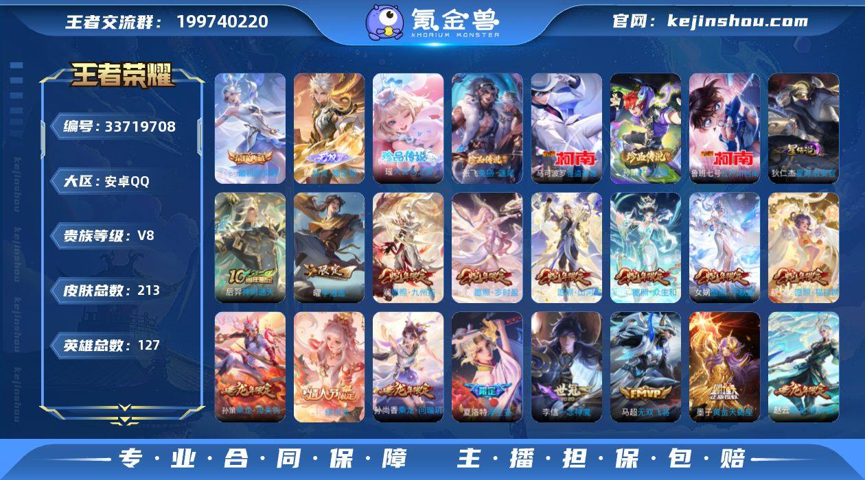 安卓Q-V8-永恒钻石II段位-127英雄-213皮肤-1典藏皮肤-1无双-5珍品传说-28传说-56史诗 【英雄全皮】:苍全皮,夏洛特全皮 【荣耀典藏】:伽罗最初的交响 【无双皮肤】:曜器灵螭龙剑 【珍品传说】:瑶大耳狗之梦,张飞兔狲蓬尾,孙策时之奇旅,鲁班七号江户川柯南,马可波罗怪盗基德 【传说皮肤】:后羿神树通天,西施续相思,杨玉环星之鸣奏,司空震愿照山河定,女娲愿照千秋盛,妲己愿照众生和,澜愿照九州拓,蔡文姬愿照福禄聚,虞姬愿照岁时盈,云缨幻光神枪,裴擒虎祥瑞亨通,桑启鸣野蒿,铠冥王哈迪斯,墨子黄金天蝎座,典韦战鼓燎原,孙尚香乘龙问璇玑,孙策乘龙淬吴钩,赵云乘龙铭钟鼎,夏洛特浮生妄,百里守约碎云,马超无双飞将,曜李逍遥 ,周瑜音你心动,虞姬启明星使,曜云鹰飞将,李信一念神魔,刘备时之恋人,狄仁杰超时空战士 【限定皮肤】:铠冥王哈迪斯,大乔绒语心约,姜子牙天穹之誓,狄仁杰阴阳师,赵云皇家上将,赵云龙胆,墨子神迹守卫,高渐离玩趣恶龙,马可波罗逐梦之星,狄仁杰魔术师,狄仁杰万华元夜,项羽海滩派对,老夫子醍醐杖,关羽冰锋战神,程咬金演武夺筹,韩信逐梦之影,虞姬启明星使,钟馗驱傩正仪,鬼谷子原初探秘者,黄忠烈魂,明世隐疑...