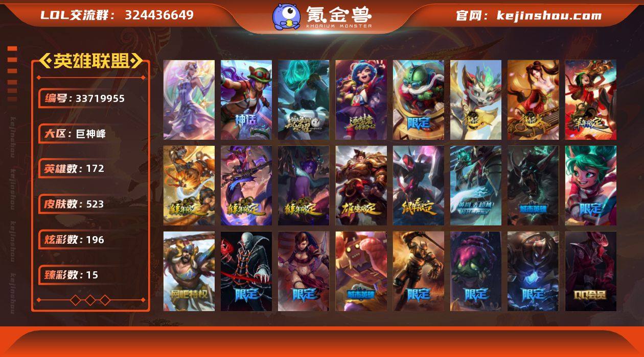 【LDC3529】172英雄/523皮肤/1终极/3神话/85限定/15臻彩/196炫彩/37传说/129史诗/未定级/卡特琳娜的匕首/10周年 安妮/源代码 乐芙兰/十五周年纪念 希维尔/天龙之子 卡莎 飞龙乘云/无畏骑士 瑟庄妮 赤子初心/吕布 奉先 炫金战神/墨之影武者 亚索 金墨耀影/冠军典狱长 锤石 凯旋圣装/弹幕天使 卡莎 炽天使·勇敢/西部魔影 卢锡安 贝利尔之怠/玉剑传说 翼剑仙 珠光/星之守护者 金克丝 黑洞/玉剑传说 神机花火 青竹/魔女 阿卡丽 虚荣/净雪之月 莫甘娜 冬虹/红莲之刃 锐雯/心之钢 伊泽瑞尔 天纵才华/古琴余韵 娑娜/神龙烈焰 金克丝/美猴王 孙悟空/紫金罗刹 莫甘娜/玉净夜叉 凯特琳/张辽 文远/王国机神朱雀 蕾欧娜/天龙之子 斯莫德/点心宝贝 阿木木/龙马烈焰波比/甜心宝贝 安妮/穿心之剑 菲奥娜/觅心游侠卢锡安/幸福女神 乐芙兰/圣诞开心鬼 提莫/圣诞精灵 崔丝塔娜/圣诞糖果棒 厄运小姐/“主人不要我了” 阿木木/胡桃夹子 小丑/平安夜女神 娑娜/英勇玩具兵船长/邪恶圣诞老人 维迦/冰雪节 茂凯/冬季仙境 发条/雪默丁格/圣诞玩偶 波比/圣诞老人 酒桶/圣诞驯鹿 克格莫/魄罗骑士 瑟庄妮/大元素使/诺斯费拉图 弗拉基米尔/地底世界 崔斯特/冠军典狱长 锤石/冠军之隐 劫/冠军之箭 艾希/S1FNC...