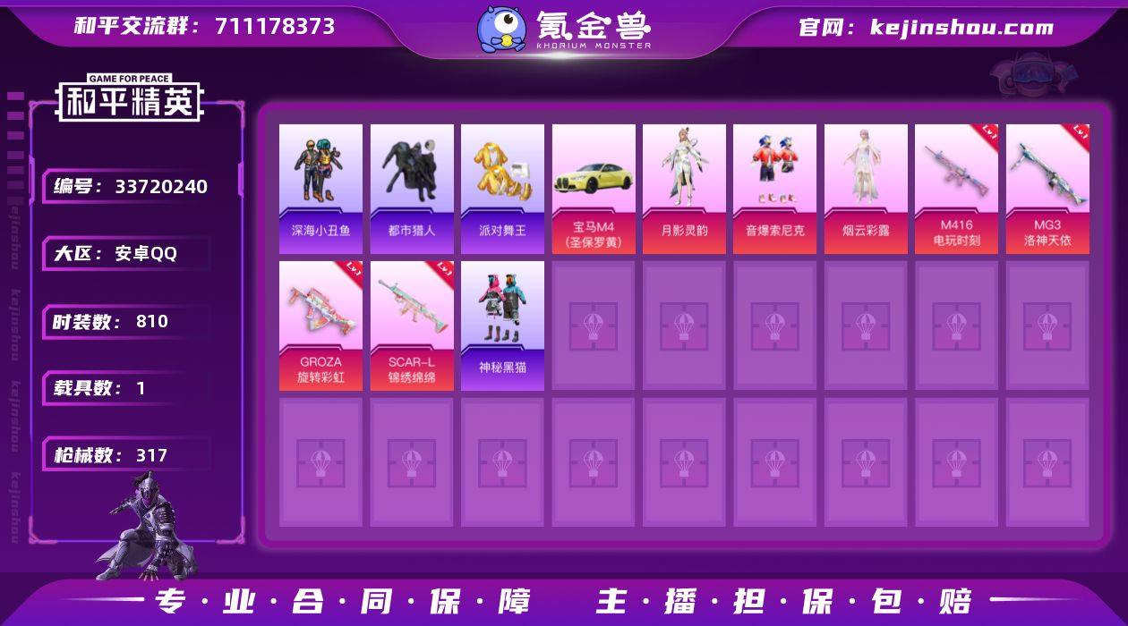 【稀有枪皮】AUG-暖羊咩咩,14-甜梦熊击,Kar98K-巳巳如意,AA12-G-萌骑幻想,ACE32-萌骑漫游,UMP45-萌骑冒险,14-福马献瑞,汤姆逊-热量炸弹,AKS-74U-森灵之息,DP-28-豹影疾电,MG-36-沧焰双生,蜜獾-异瞳寒姬,M416电玩时刻,MG3洛神天依,GROZA旋转彩虹,SCAR-L-锦绣绵绵