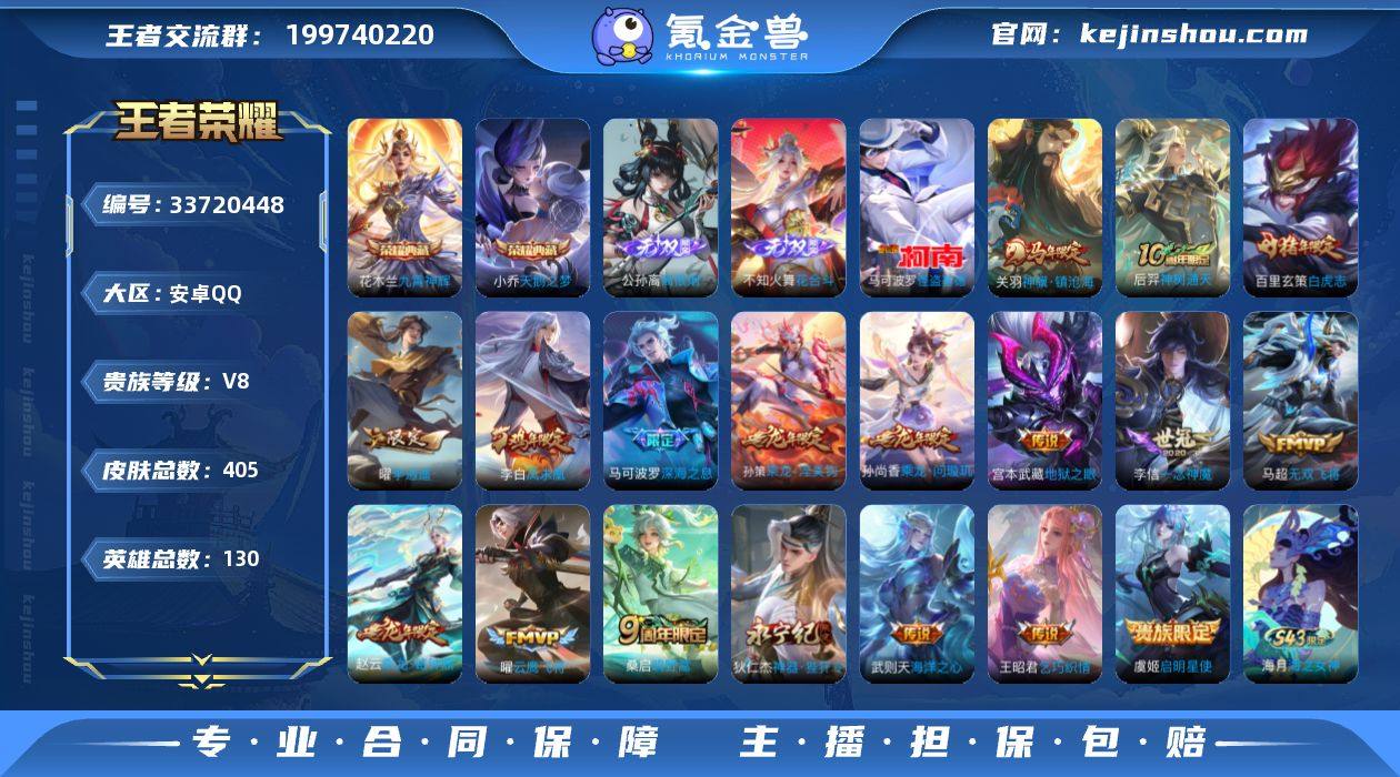 【王者荣耀】珍品无双0 典藏3 无双2 珍品传说1 传说19 史诗123 英雄130 皮肤405 贵族8级 荣耀典藏:天鹅之梦|武则天|九霄神辉__无双皮肤:离恨烟|花合斗__珍品传说:怪盗基德__传说皮肤:鸣野蒿|深海之息|无双飞将|启明星使|地狱之眼|海洋之心|狄仁杰-超时空战士|一念神魔|云鹰飞将|李逍遥|乞巧织情|白虎志|凤求凰|乘龙·淬吴钩|乘龙·铭钟鼎|乘龙·问璇玑|神器·狴犴令|神树通天|神骥·镇沧海__稀有限定:寅虎·心曲|至尊宝|青龙志|引擎之心|飞衡|蔷薇恋人|奇迹圣诞|烈魂|孙行者|猪悟能|女儿国国王|李小龙|梁祝|狮舞东方|拒霜思|暗影游猎|白昼王子|百解令|大漠名商|电玩高手|繁星吟游|高山流水|古海寻踪|海滩派对|海盐诗旅|华丽摇滚|皇家上将|混沌棋|剑破天穹|江河有灵|金庭之子|狂想玩偶喵|蓝屏警告|黎明之约|炼金王|魔术师|匿光决锋者|匿光侦查者|女武神|千军破阵|擒涛扼浪|青焰无极|驱傩正仪|燃音魔法|荣光圣徽|沙漠行僧|蜃楼王|朔风刀|死亡摇滚|探海日志|饕餮|醍醐杖|天狼绘梦者|天狼狩猎者|天狼溯光者|天狼运算者|天狼征服者|天穹祈灯|玩趣恶龙|万华元夜|妄想食味|无心|五谷丰年|午后时光|纤云弄巧|星空之诺|驯魔猎人|演武夺筹|妖精王|夜都魔契|疑决卦|阴阳师|银河之约|驭风魔法|遇...