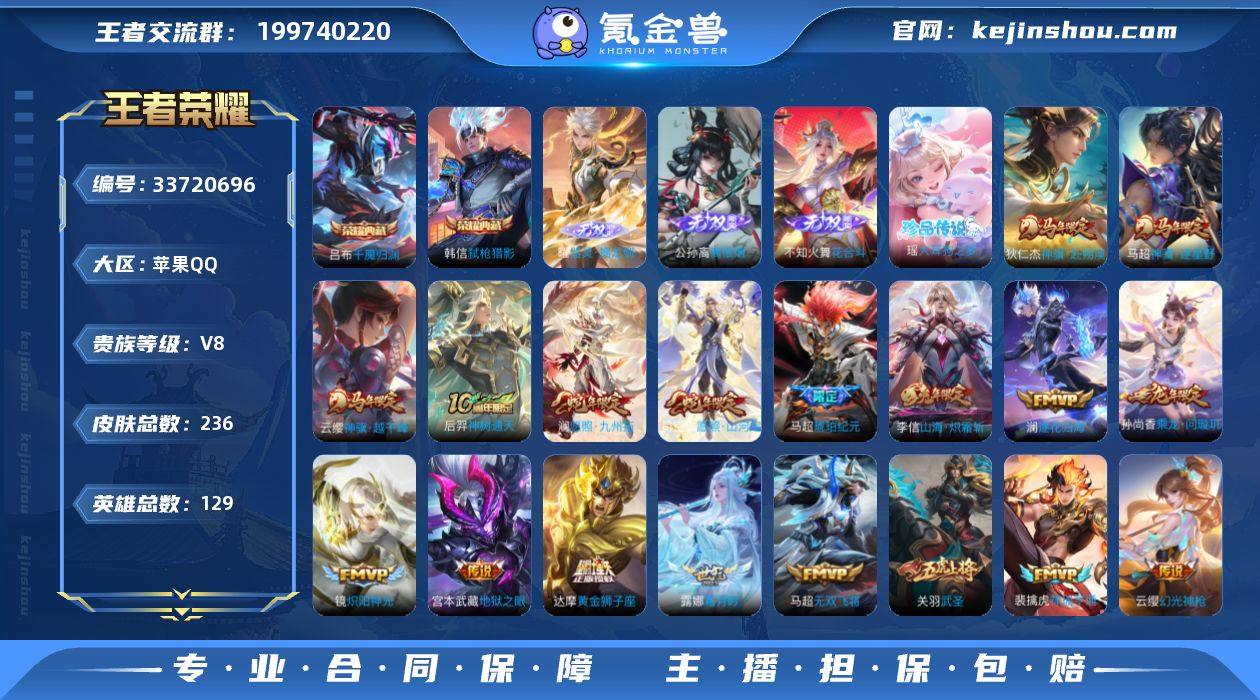 实名: 可修改 性别: 男号 贵族等级: V8 英雄数: 129 皮肤数: 236 荣耀水晶: 弑枪猎影,千魇归渊 无双皮: 花合斗,离恨烟,器灵·螭龙剑 珍品传说: 大耳狗之梦 传说皮: 黄金狮子座,冠军飞将,绛天战甲,黄金白羊座,炽阳神光,地狱之眼,无双飞将,山海·炽霜斩,妄想实况,霜月吟,澜逐花归海,琥珀纪元马超,乘龙·问璇玑,幻光神枪,祥瑞亨通,神树通天,神骥·赴朔漠,神骥·越千峰,神骥·逐星野 限定皮: 李小龙,武圣,冰霜恋舞曲,五谷丰年,诗剑行,怒海麟威,山海·玄木吟,齐天大圣,鸣野蒿,愿照·山河定,愿照·九州拓 亮点: 【优质装备】:弑枪猎影(韩信典藏),花合斗,离恨烟(公孙离无双),器灵·螭龙剑,大耳狗之梦,黄金狮子座,冠军飞将,绛天战甲(鸡嘴战神),黄金白羊座,炽阳神光,地狱之眼,无双飞将,山海·炽霜斩(李信年限),妄想实况,霜月吟,澜逐花归海,琥珀纪元马超,涂山容容