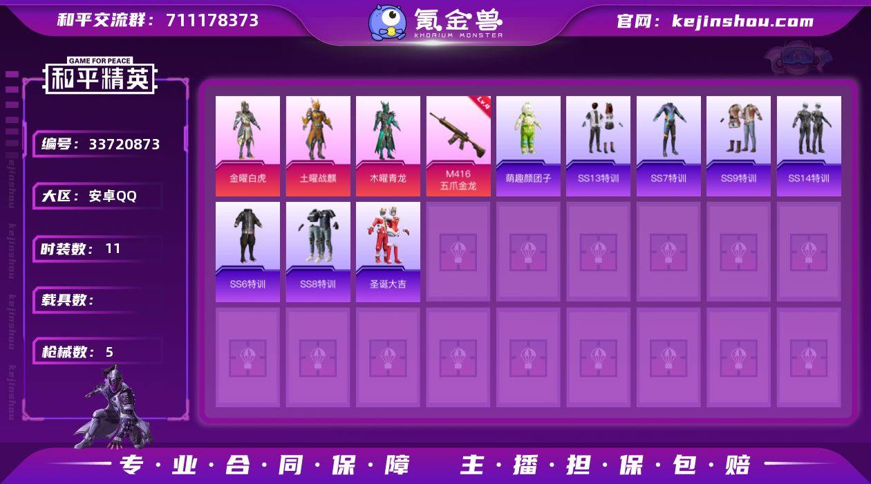 3粉装1特效枪 4级五爪金龙m4 s1上衣 【和平精英】3粉装,1特效枪,0载具,历史最高段位:不朽星钻Ⅳ 王牌印记-2次 热力值:11604,30套装,27枪械,34装备,20战备;套装:套装-金曜白虎,套装-木曜青龙,套装-土曜战麒,套装-黑色伏地魔,套装-骑行爱好者,套装-酒红色名流,套装-竞技勇士朋克,套装-黎明保卫者,套装-战地菁英,套装-完美偶像,套装-绮丽涂鸦,套装-雪山征服者,套装-雪山精英,套装-甜蜜熊情侣,套装-格斗先锋,套装-疯狂小兔子,套装-SS5特训,套装-圣诞大吉,套装-冰原使者,套装-凛冬战士,套装-北国孤狼,套装-SS6特训,套装-SS7特训,套装-SS8特训,套装-SS9特训,套装-牛气满满,套装-萌趣颜团子,套装-飞行日记,套装-SS13特训,套装-SS14特训;枪皮:GROZA-乌木金纹,AUG-幻影战神,AUG-乌木金纹,4级M416-五爪金龙,M416-夜灯,SCAR-L-炫彩节奏,SCAR-L-乌木金纹,QBZ-乌木金纹,M762-牛气冲天,AKM-夜灯,AKM-乌木金纹,M24-冰封烈焰,M24-香水柠檬,AWM-乌木金纹,Mini14-炫彩节奏,SKS-夜灯,Vector-彩虹符号,Vector-乌木金纹,汤姆逊-幻影战神,汤姆逊-乌木金纹,S686-生命誓言,S686-冰封烈焰,S12K-乌木金纹,M249-乌木金纹,P1911-冰封烈焰...