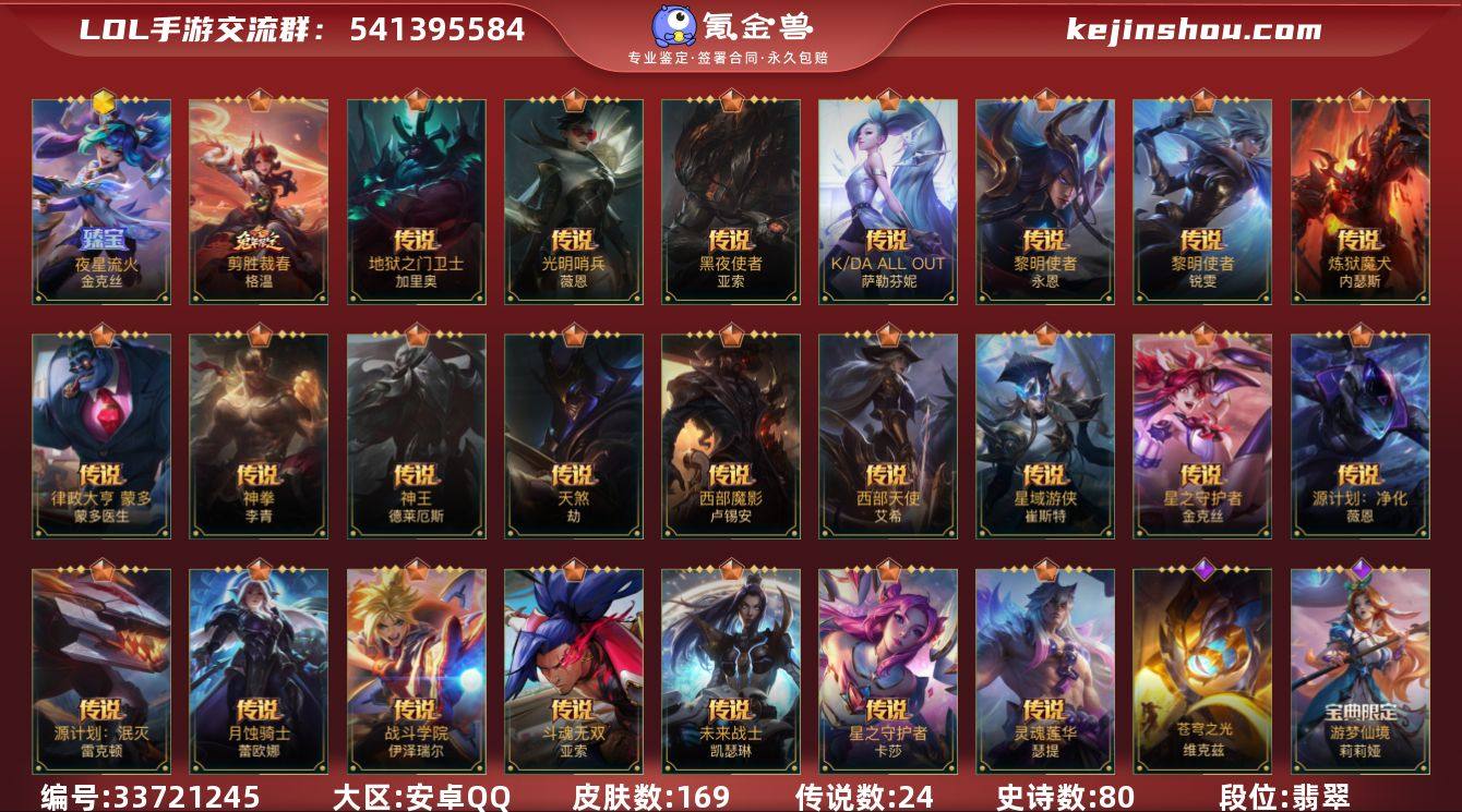 实名: 可修改 段位: 翡翠 皮肤数: 169 神话皮: 夜星流火 金克丝 限定皮肤: 水晶玫瑰永恩,斩星魔剑 传说皮: 地狱之门卫士,光明哨兵薇恩,黑夜使者亚索,K/DA ALLOUT萨勒芬妮,黎明使者锐雯,炼狱魔犬,律政大亨,神拳盲僧,神王诺手,天煞劫,西部魔影卢锡安,西部天使寒冰,星域游侠卡牌,星之守护者金克丝,源计划:净化,月蚀骑士蕾欧娜,战斗学院ez,剪胜裁春格温,黎明使者永恩,源计划:泯灭,斗魂无双亚索,未来战士女警,星之守护者卡莎,灵魂莲华腕豪 亮点: 【优质装备】:光明哨兵薇恩,黑夜使者亚索,K/DA ALLOUT萨勒芬妮,黎明使者锐雯,炼狱魔犬,律政大亨,神拳盲僧,神王诺手,天煞劫,西部魔影卢锡安,西部天使寒冰,星域游侠卡牌,星之守护者金克丝,源计划:净化,月蚀骑士蕾欧娜,战斗学院ez,玉剑传说 武剑仙,剪胜裁春格温,源计划:泯灭,未来战士女警,星之守护者卡莎,灵魂莲华腕豪