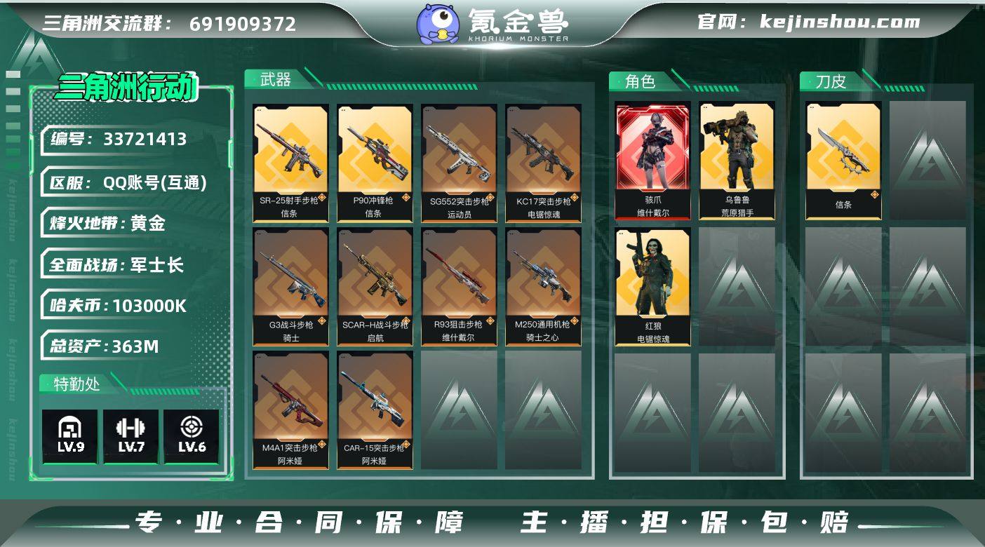 【960050】[19006897]总资产:363M 4干员外观 1近战传说 28传说枪械 哈夫币:103000K 可二次 可修改实名 【烽火地带段位】黄金 【全面战场段位】军士长 【干员外观】乌鲁鲁-荒原猎手,骇爪-维什戴尔,红狼-电锯惊魂,露娜-金牌射手(S7) 【传说武器皮肤】近战-信条,SG552突击步枪-运动员,SR-25射手步枪-信条,G3战斗步枪-骑士,KC17突击步枪-电锯惊魂,P90冲锋枪-信条,UZI冲锋枪-悠然茶歇,M250通用机枪-骑士之心,R93狙击步枪-维什戴尔,SCAR-H战斗步枪-启航,SKS射手步枪-骑士,SR-3M紧凑突击步枪-茶蘼,Vector冲锋枪-夜莺,MK4冲锋枪-夜莺,Mini-14射手步枪-夜莺,SCAR-H战斗步枪-茶蘼,SMG-45冲锋枪-锦绣,K437突击步枪-锦绣,AKM突击步枪-锦绣,MK47突击步枪-悠然茶歇,PKM通用机枪-茶蘼,AUG突击步枪-悠然茶歇,M14射手步枪-蛮荒,腾龙突击步枪-马年祥瑞,G18-马年祥瑞,QCQ171冲锋枪-不羁人生,M4A1突击步枪-阿米娅,CAR-15突击步枪-阿米娅