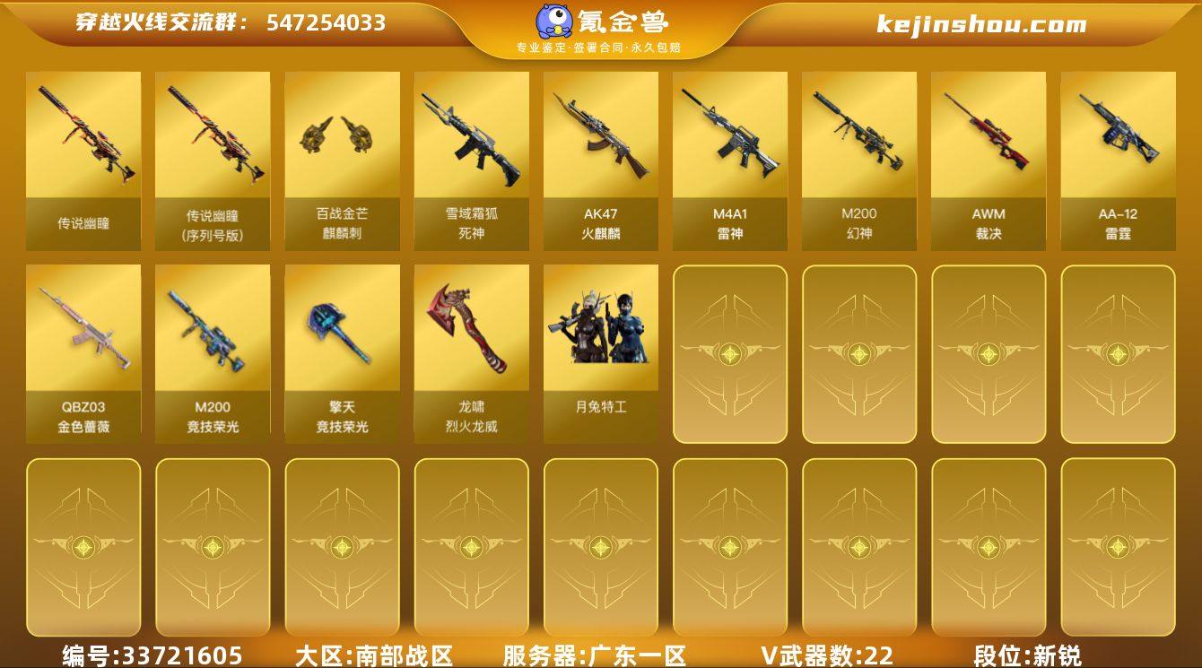 【960063】2英雄角色 22V武器 可二次 可修改实名 【排位资格】有 【V武器】M200-幻神,QBZ03-金色蔷薇,麒麟刺-百战金芒,传说幽瞳,传说幽瞳(序列号版),QBZ191-银翼游侠,死神-雪域霜狐,龙啸-烈火龙威,M200-竞技荣光,AK47-火麒麟,M4A1-雷神,AWM-裁决,AA-12-雷霆,擎天-竞技荣光 【英雄角色】月兔特工 【音效道具】死神-雪域霜狐-怀旧音效卡