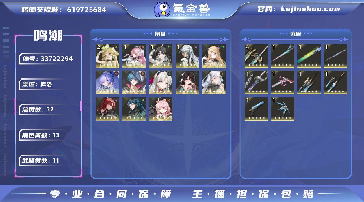 男/女主: 男主 总黄数: 32 联觉等级: 77 拥有五星共鸣者: 忌炎,鉴心,卡卡罗,安可,维里奈,吟霖,今汐,折枝,珂莱塔,布兰特,坎特蕾拉,卡提希娅,爱弥斯 2鸣五星共鸣者: 2鸣维里奈 1鸣五星共鸣者: 1鸣鉴心,1鸣卡卡罗,1鸣爱弥斯 0鸣五星共鸣者: 0鸣忌炎,0鸣安可,0鸣吟霖,0鸣今汐,0鸣折枝,0鸣珂莱塔,0鸣布兰特,0鸣坎特蕾拉,0鸣卡提希娅 拥有五星武器: 浩境粼光,千古洑流,停驻之烟,漪澜浮录,死与舞,不灭航路,血誓盟约,不屈命定之冠,镭射切变,永远的启明星 4鸣五星武器: 4鸣血誓盟约 1鸣五星武器: 1鸣浩境粼光,1鸣千古洑流,1鸣停驻之烟,1鸣漪澜浮录,1鸣死与舞,1鸣不灭航路,1鸣不屈命定之冠,1鸣镭射切变,1鸣永远的启明星 亮点: 【MC332】77级/32黄/男主/13个五星角色/11个五星武器未绑定,爱弥斯,卡提希娅,布兰特,坎特蕾拉,今汐,珂莱塔,吟霖,折枝,忌炎,维里奈,卡卡罗,鉴心,安可,永远的启明星,镭射切变,不屈命定之冠,血誓盟约,不灭航路,死与舞,浩境粼光,千古洑流,停驻之烟,漪澜浮录,2命维里奈,1命爱弥斯,1命卡卡罗,1命鉴心,0命卡提希娅,0命布兰特,0命坎特蕾拉,0命今汐,0命珂莱塔,0命吟霖,0命折枝,0命忌炎,0命安可,精4血誓盟约,精1永远的启明星,精1镭射切变,精1不屈命定之冠,精1不灭航路,精1...