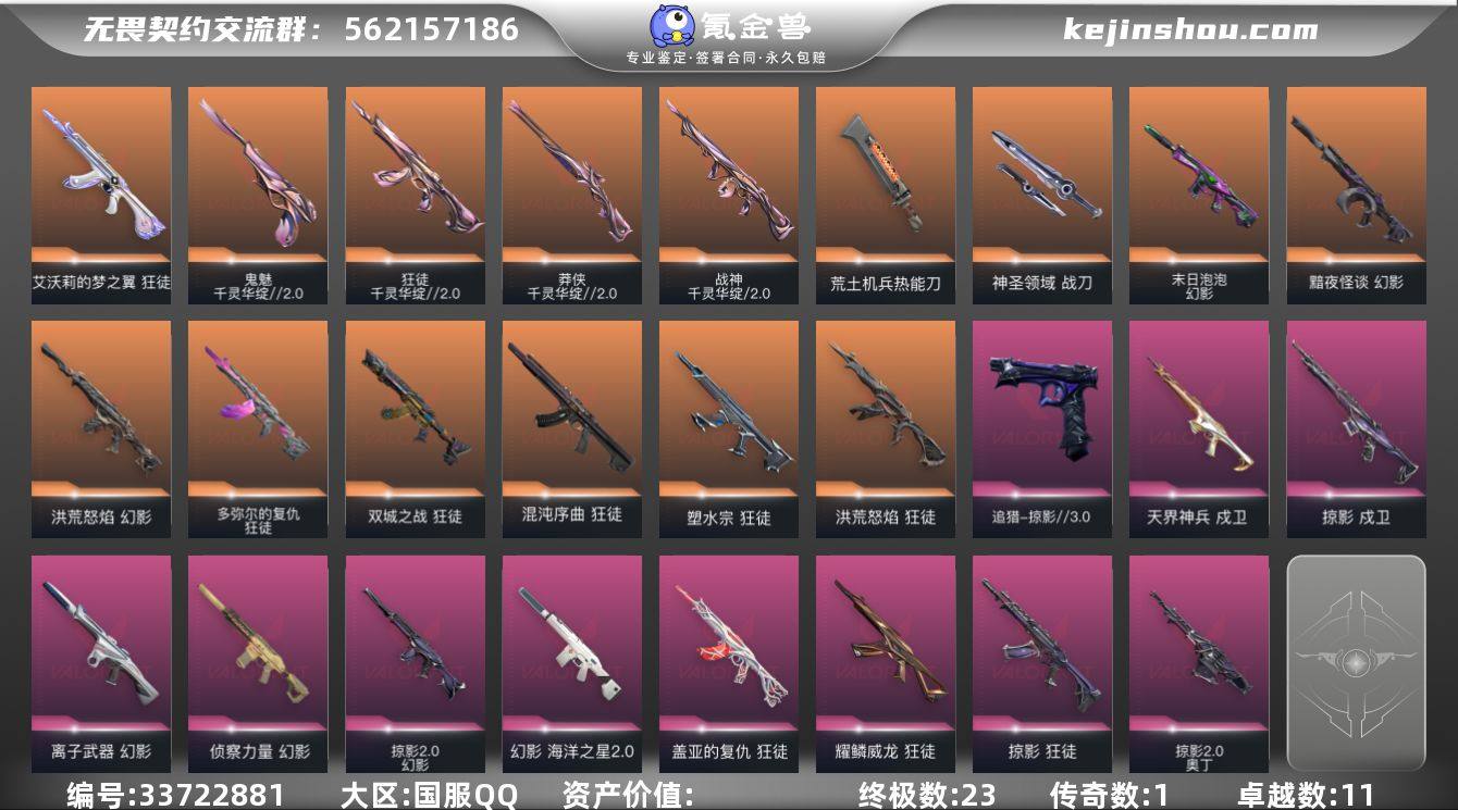【qyz10017】【⭐ 可二次 卖号能回血掠夺2.0套装+千灵2.0套装 精品成品号 5w库存 全是精品皮肤 】 qyz10017 【近战武器】:近战武器-蒙太奇 战斧,近战武器-碎心裂刃,近战武器-影蝶,近战武器-流风回雪,近战武器-影钩,近战武器-黑波之刃,近战武器-威龙之刃,近战武器-荒土机兵 热能刀,近战武器-神圣领域 战刀 【狂徒】:狂徒-洪荒怒焰,狂徒-混沌序曲,狂徒-双城之战,狂徒-塑水宗,狂徒-多弥尔的复仇,狂徒-千灵华绽//2.0,狂徒-荆刺圣骸,狂徒-艾沃莉的梦之翼,狂徒-掠影,狂徒-盖亚的复仇,狂徒-耀鳞威龙,狂徒-荒土机兵 【幻影】:幻影-黯夜怪谈,幻影-洪荒怒焰,幻影-末日泡泡,幻影-离子武器,幻影-侦察力量,幻影-海洋之星//2.0,幻影-掠影//2.0,幻影-神圣领域,幻影-蒙太奇,幻影-纳米打击 【戍卫】:戍卫-掠影,戍卫-天界神兵,戍卫-逆冲蛮牛,戍卫-月球哨兵 【獠犬】:獠犬-神圣领域,獠犬-逆冲蛮牛 【冥驹】:冥驹-荒土机兵,冥驹-星云暗涌 【莽侠】:莽侠-千灵华绽//2.0,莽侠-月球哨兵 【战神】:战神-千灵华绽//2.0,战神-神圣领域,战神-蒙太奇 【奥丁】:奥丁-掠影//2.0,奥丁-纳米打击 【判官】:判官-纳米打击x 【雄鹿】:雄鹿-逆冲蛮牛,雄鹿-月球...