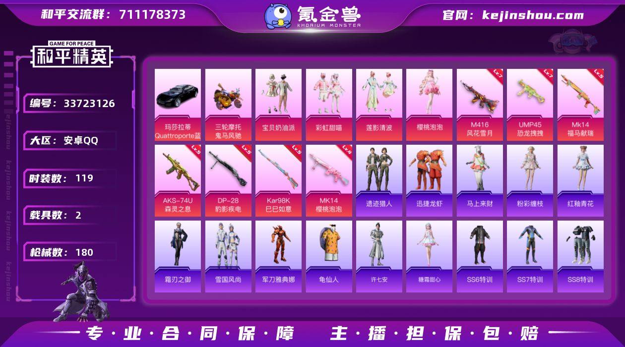 安卓 手Q-4粉装-7特效枪-2载具-2粉色飞行器-56763热力值-13王牌印记-119套装-180枪皮 【热门品类】:角色-军刀雅典娜,套装-龟仙人 【粉色套装】:粉装-宝贝奶油派,粉装-彩虹甜喵,粉装-莲影清波,角色-樱桃泡泡 【粉色枪皮等级】:M416-风花雪月(七级),UMP45-恐龙拽拽(七级),AKS-74U-森灵之息(五级),Kar98K-巳巳如意(五级),Mk14-樱桃泡泡(四级),Mk14-福马献瑞(五级),DP-28-豹影疾电(五级) 【粉色载具】:玛莎拉蒂Quattroporte(夜幕蓝),鬼马风驰 【粉色枪皮】:M416-风花雪月,UMP45-恐龙拽拽,AKS-74U-森灵之息,Kar98K-巳巳如意,Mk14-樱桃泡泡,Mk14-福马献瑞,DP-28-豹影疾电 【粉色飞行器】:炫彩糖果飞行器 【粉色降落伞】:百万伏特降落伞,古堡领主降落伞,恐龙拽拽降落伞,垂柳戏鸭降落伞,临安公主降落伞,樱桃泡泡降落伞,炫彩糖果降落伞,灵驹仙姬降落伞 【稀有套装】:套装-龟仙人,套装-雪国风尚,套装-炫彩糖果,套装-马上来财,套装-迅捷龙虾,套装-遗迹猎人,角色-许七安,角色-糖霜甜心,角色-霜刃之御,套装-粉彩缠枝,套装-雨过天青,套装-红釉青花 【稀有枪皮】:AUG-冰晶雪宝,AKM-夜灯,AKM-星之彼岸,AKM-灼热熔岩,AKM-生命誓言,AKM-百万...