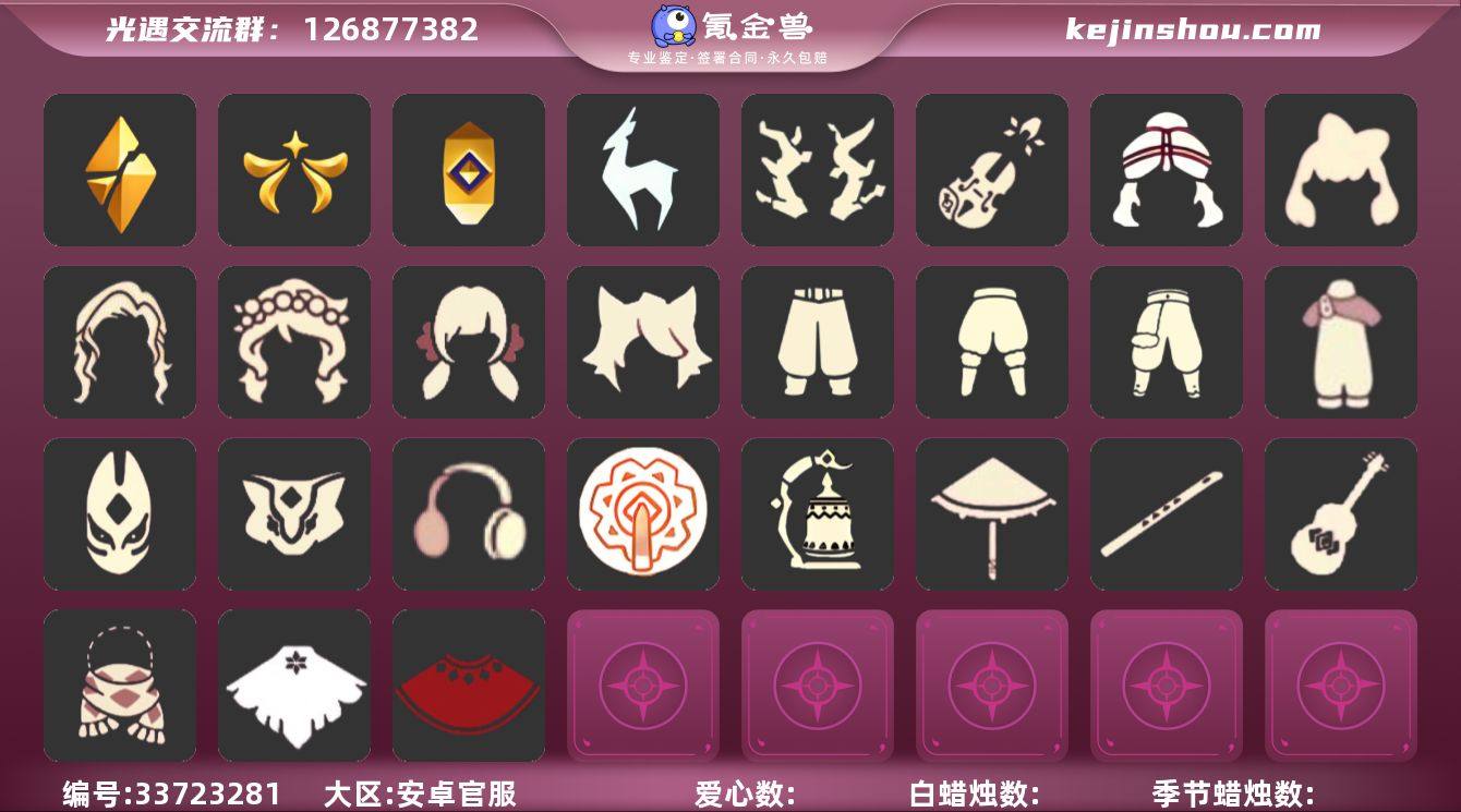 账号类型: 邮箱账号 季节已毕业: 破晓季,欧若拉季,追忆季,九色鹿季 完成地图: 晨岛,霞谷 珍稀物品: 透明蝶翼斗 礼包: 枯角,小提琴 裤子: 武士裤,背带裤,白棉裤,搓澡巾 面具: 黄鼠狼,红狐狸 面饰: 红耳机 项链: 围巾 发型: 蝴蝶结,樱花,公主头,虚荣,猫耳 头饰: 花环 斗篷: 红金,白鸟斗 配饰: 雨伞,吉他,笛子,大铃铛乐器,乐器 亮点: 重塑药水49